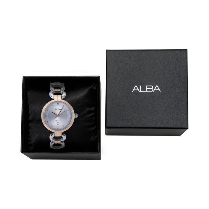 Complement your style with this classic watch from Alba. A timepiece that features an enchanting dial in subtle tone with high precision movement. This exquisite timepiece embodies the brand's commitment to unmatched quality and excellence. With its sleek design and precise movement, the Alba watch has become synonymous with style, capturing the hearts of fashion-forward women.