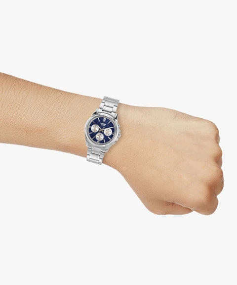 Striking and sophisticated — a classic metal analog timepiece dressed up with a dial in bold color. Handy inset dials display day, date, and 24-hour clock. Water resistance up to 50 meters frees you from worry, even on rainy days.