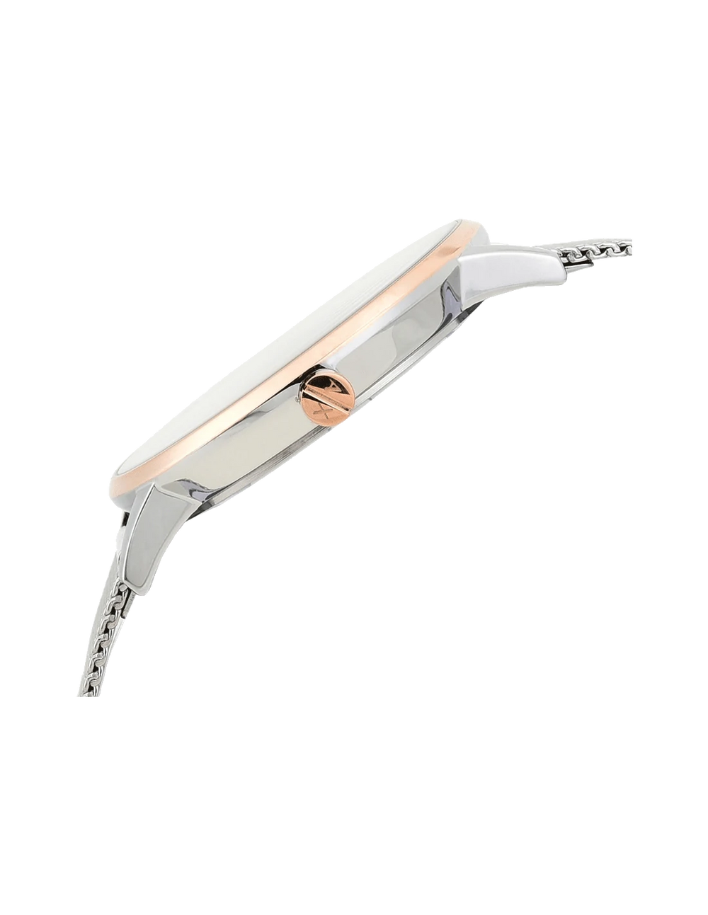 A must-have timepiece for all the watch aficionados, this women's analog watch from Armani Exchange will be a perfect pick. Its strap vaunts a silver hue that enhances the look of the watch. Housed in a case, the silver round dial is protected by a mineral glass. It showcases plain 3-hand, and a crown for time adjustment. Furthermore, it is complemented with a deployment clasp clasp that ensures a secure fit on the wrist.