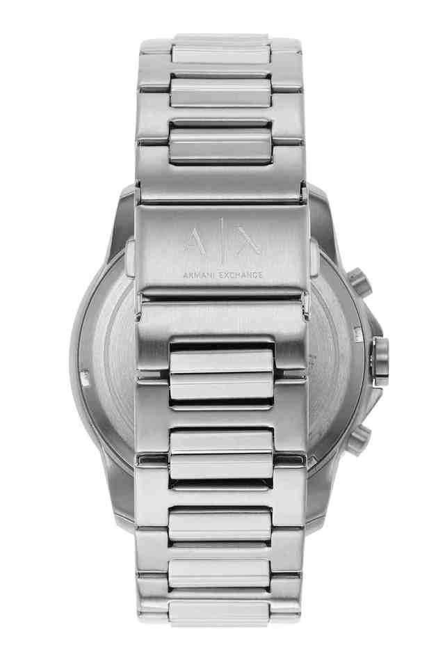 Armani Exchange's 44 mm watch features a black cd texture and sunray dial with silver stick indexes, chronograph movement and stainless steel bracelet.