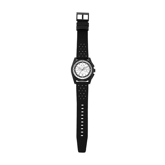 ARMANI EXCHANGE 42 mm Chronograph Black Watch features a sleek gray matte dial, precise quartz chronograph movement, and a durable black strap. The round case and mineral crystal add to its robust design, making it a versatile and stylish timepiece for any occasion.