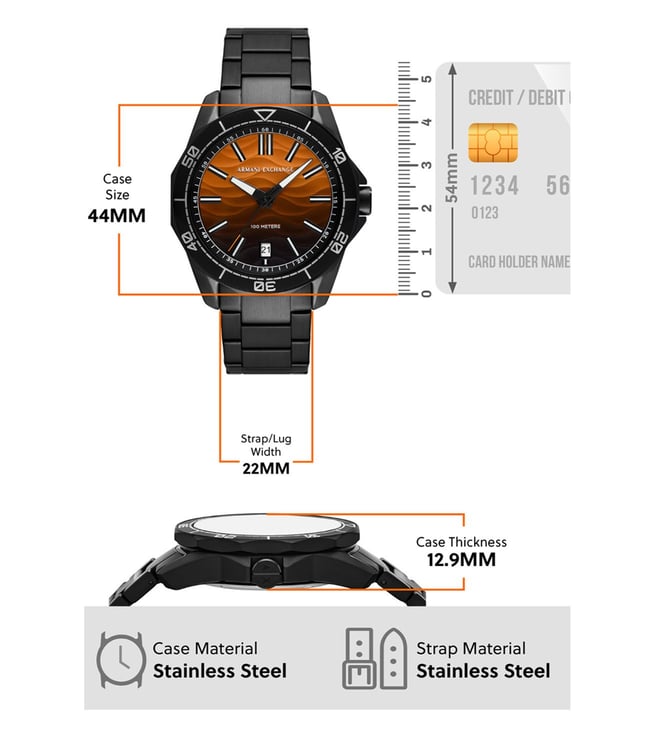 Armani Exchange's 44mm watch features an orange and black textured dial, three-hand date movement and black stainless steel bracelet.if you are looking for a refined look. Known for its distinctive pattern, this timepiece stands out. With a stunning design and charming looks, this is an exquisite wristwatch made for Every one.