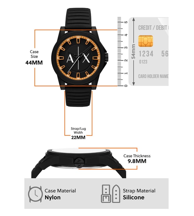 Armani Exchange's 44mm watch features a black matte dial, three-hand movement and black silicone strap.if you are looking for a refined look. Known for its distinctive pattern, this timepiece stands out. With a stunning design and charming looks, this is an exquisite wristwatch made for Every one.