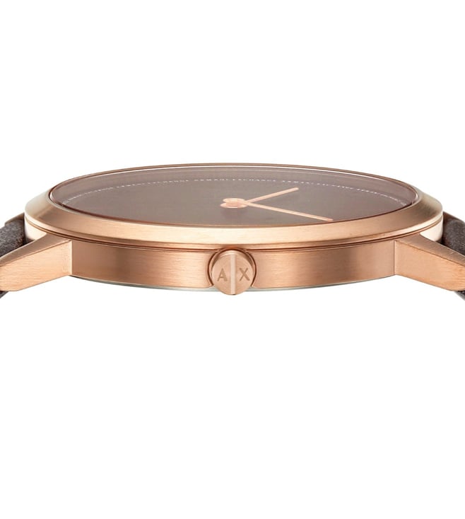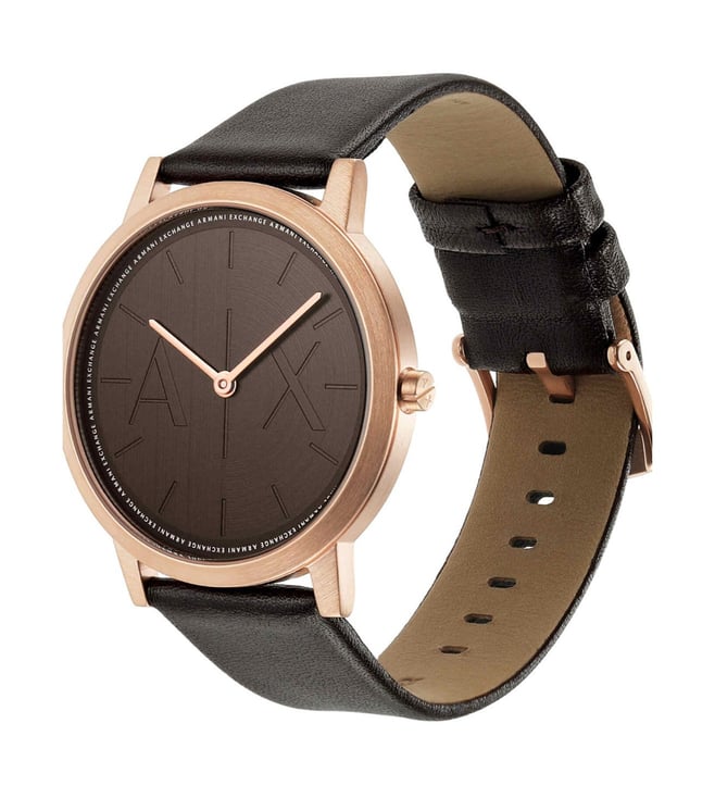 Carry great technology wrapped around your wrist with this stylish men's analog watch from Armani Exchange. The brown round dial is protected by a mineral glass. It has a crown for time adjustment. The genuine leather strap comes in a brown hue that further elevates the look of the timekeeper. Besides, it is completed with a buckle clasp to ensure a secure fit on the wrist.
