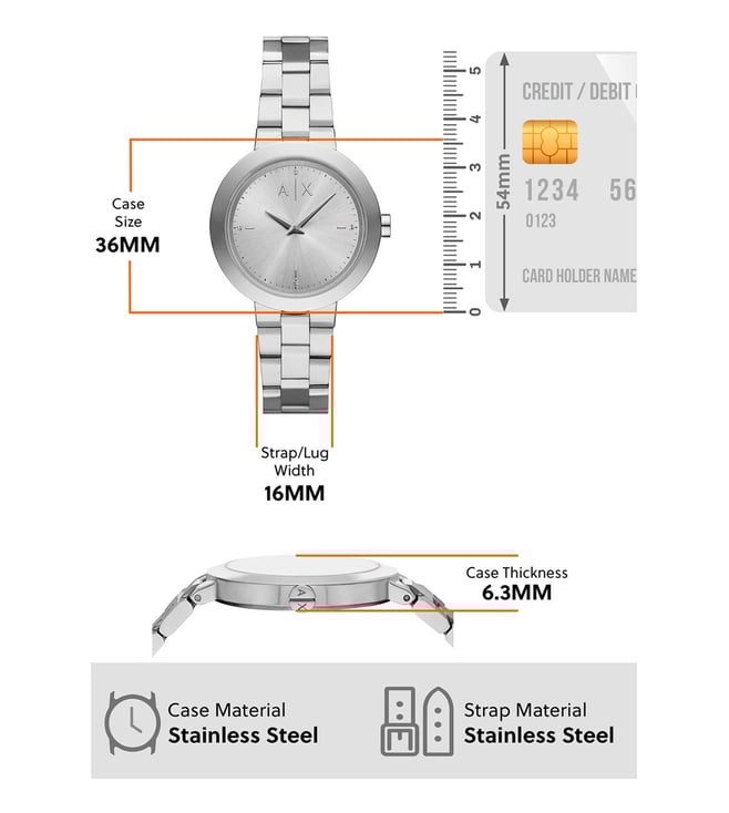 Armani Exchange's 36mm watch features a silver sunray dial, two-hand movement and stainless steel bracelet. Amaze everyone around you by wearing this women's analog watch from the collection by Armani Exchange. The silver round dial is protected by a mineral glass. It features a crown for time adjustment.