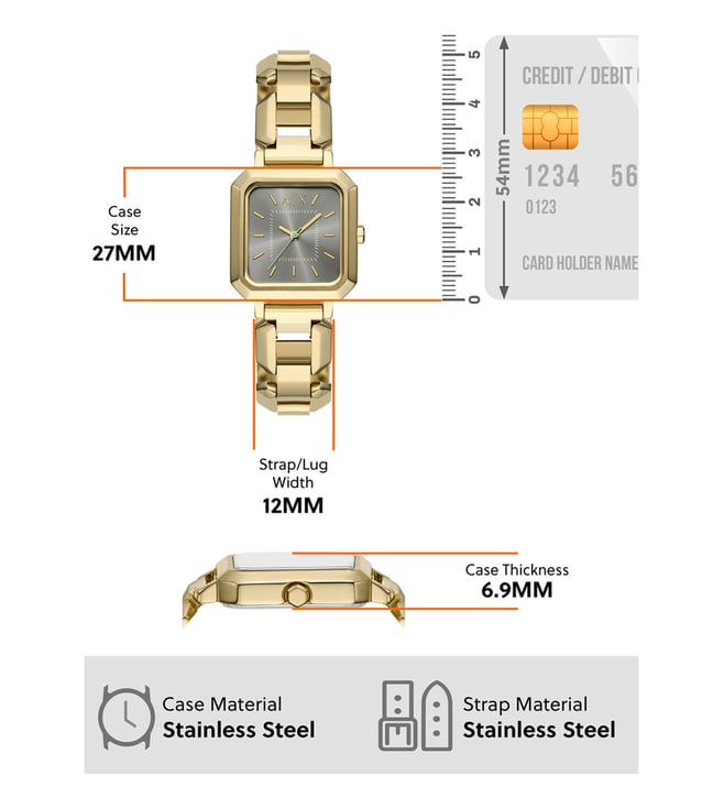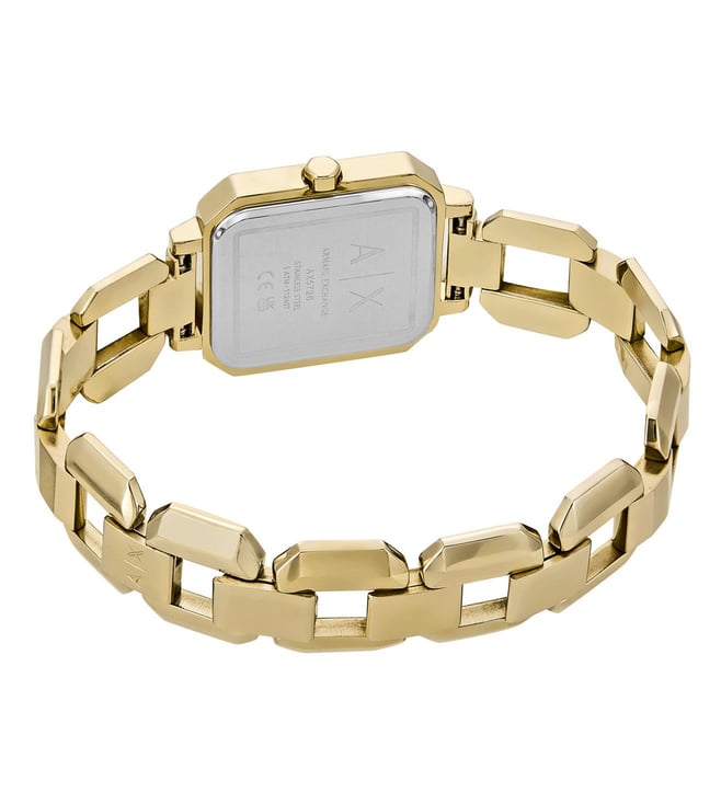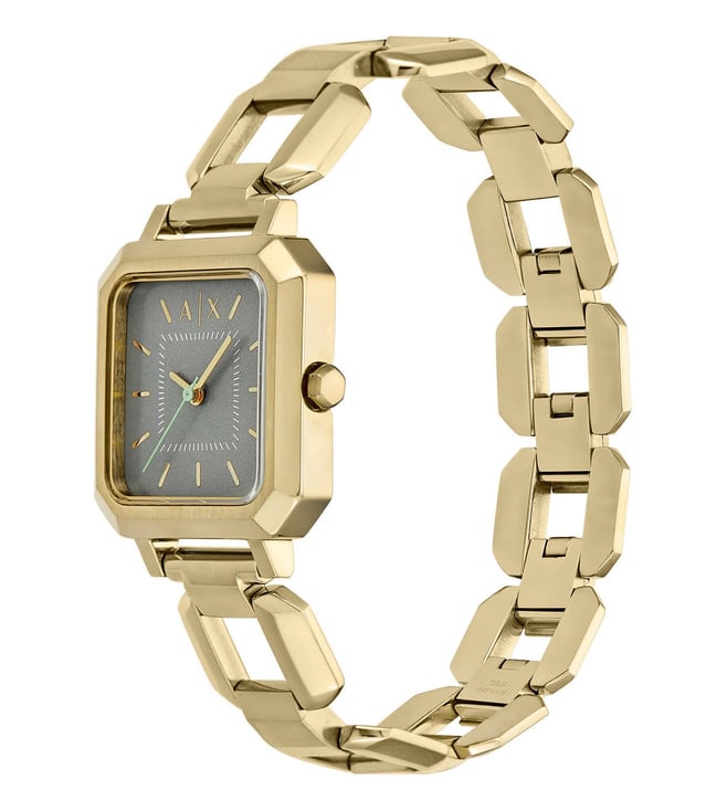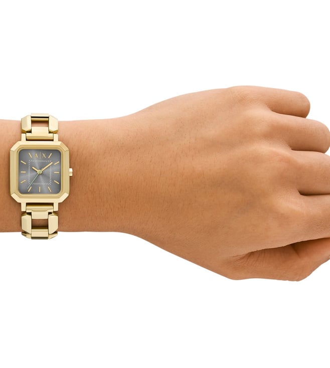 Armani Exchange's 27mm watch features a grey sunray dial, three-hand movement and gold-tone stainless steel bracelet. Amaze everyone around you by wearing this women's analog watch from the collection by Armani Exchange. The grey rectangular dial is protected by a mineral glass. It features a crown for time adjustment.