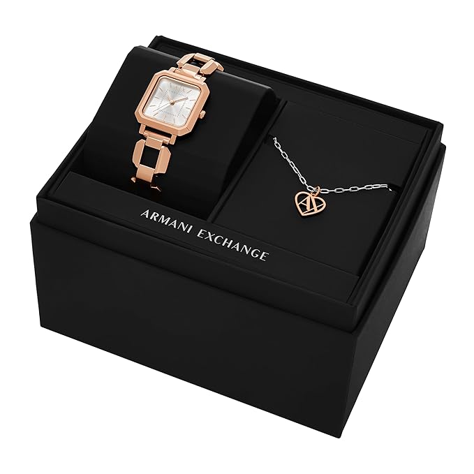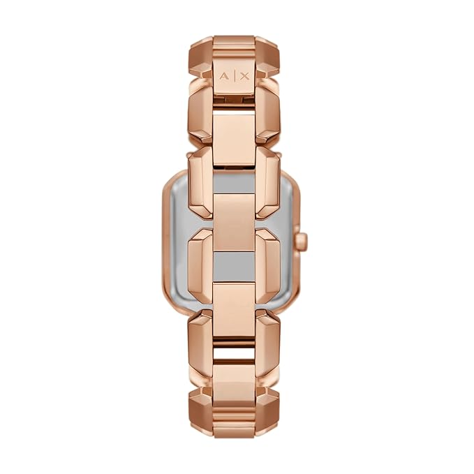 Armani Exchange's 27mm three-hand watch features a sophisticated gold sunray dial housed in a sleek rectangular case. The rich brown leather double-wrap strap adds a touch of timeless elegance, making it the perfect complement to any outfit. With its reliable quartz movement and durable mineral crystal, this watch combines style and functionality, making it an ideal choice for modern women seeking both form and practicality in their accessories.