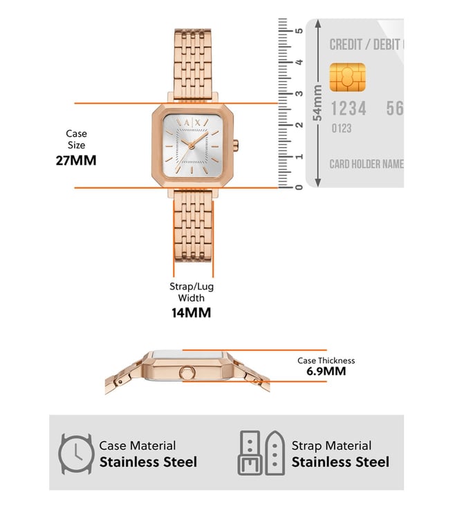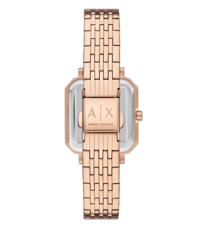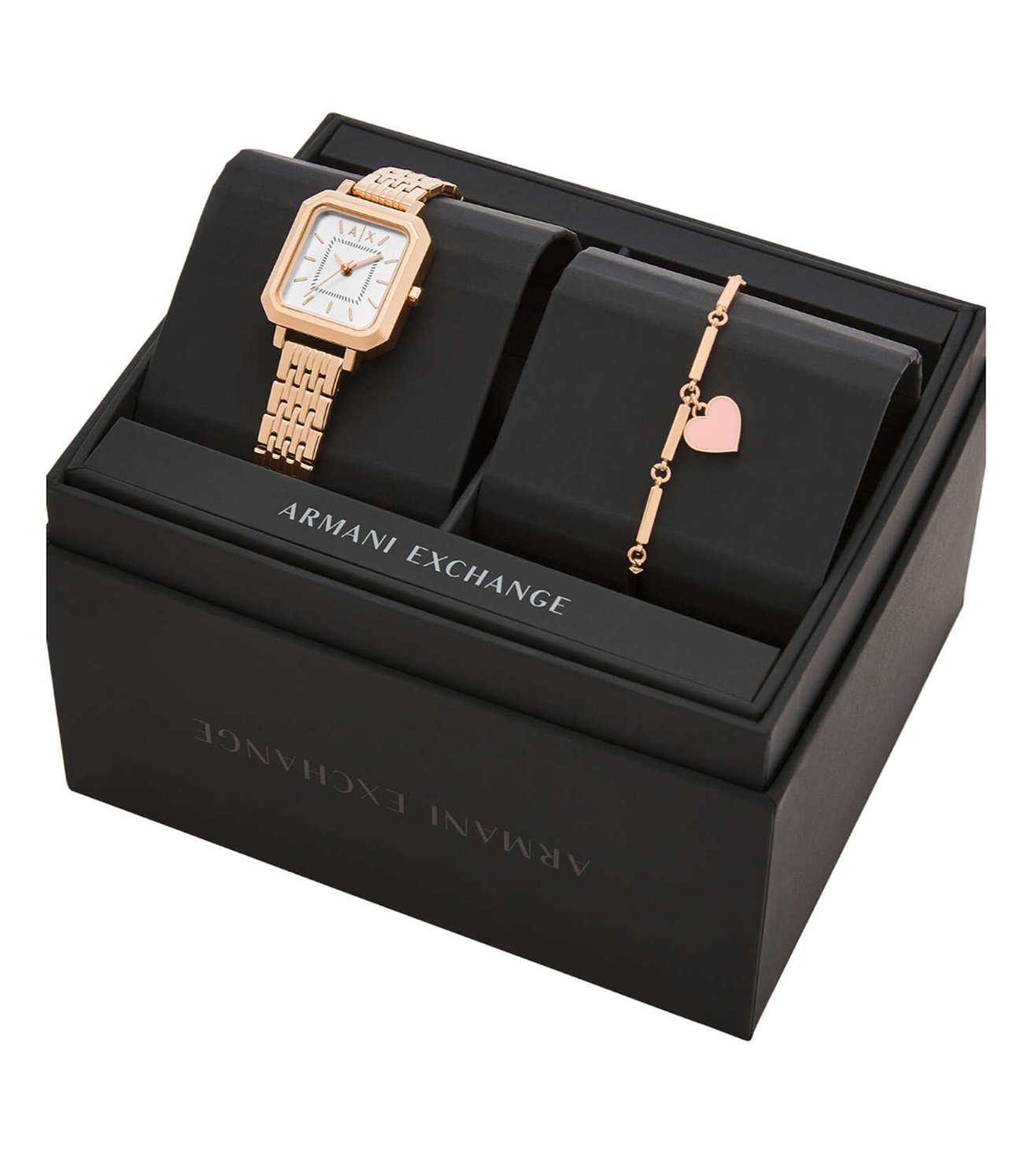 Armani Exchange's gift set includes a rose gold-tone brass bracelet and a 27mm watch featuring a silver sunray dial, three-hand movement and rose gold-tone stainless steel bracelet.if you are looking for a refined look. Known for its distinctive pattern, this timepiece stands out. With a stunning design and charming looks, this is an exquisite wristwatch made for Every one.