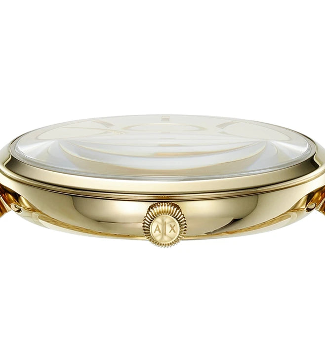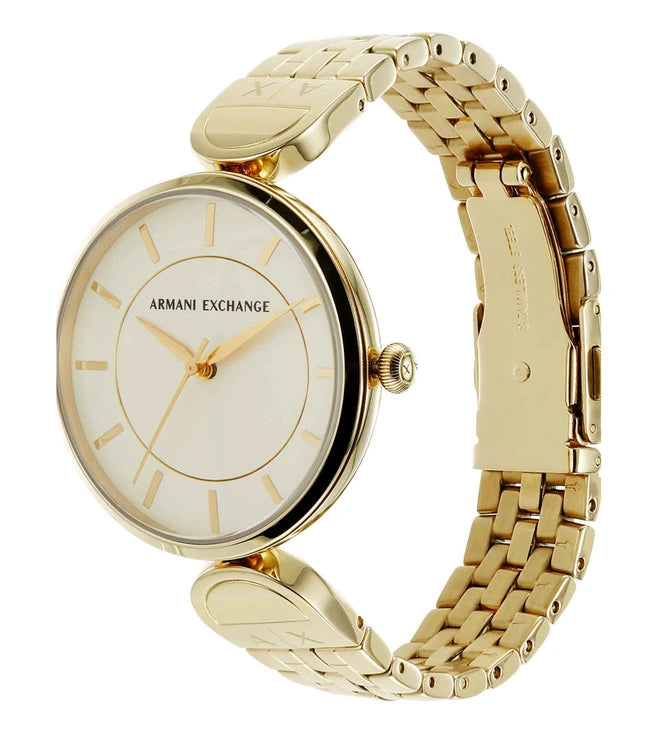 Add a stylish dimension to your look by wearing this women analog watch from Armani Exchange. Covered by a mineral glass, the cream round dial. It has a crown for time adjustment. The stainless steel strap exudes a gold hue that accentuates the look of the timepiece. Moreover, it is fitted with a fold-over clasp with double push button safety clasp that ensures a secure fit on the wrist.