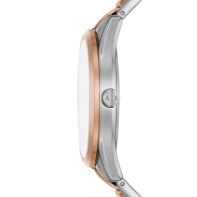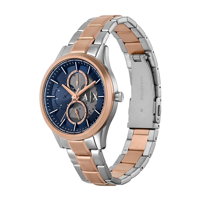 Give your timepiece collection a completion with this men's analog watch from Armani Exchange. The blue round dial is protected by a mineral glass. It has a crown for time adjustment. The stainless steel strap comes in a two tone hue that further elevates the look of the timekeeper. Armani Exchange's 42mm watch features a blue sunray dial, multifunction movement and two-tone stainless steel bracelet.