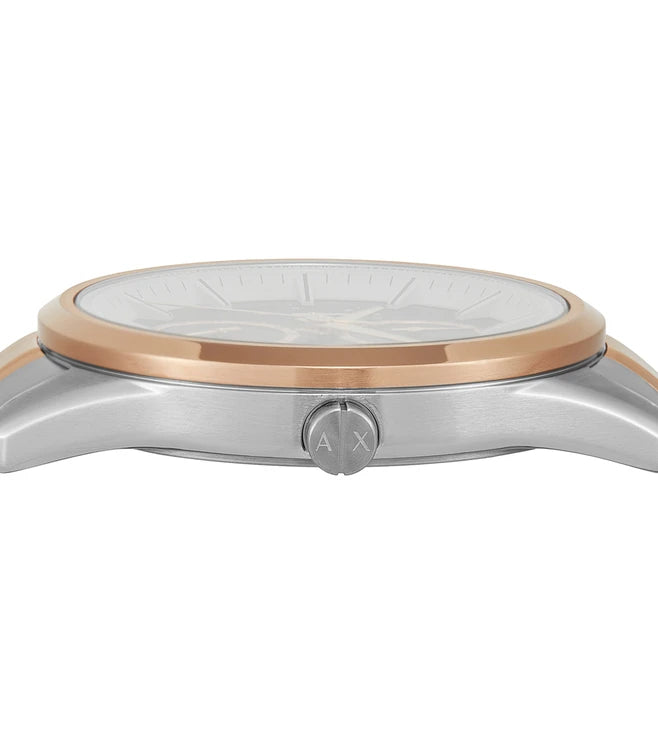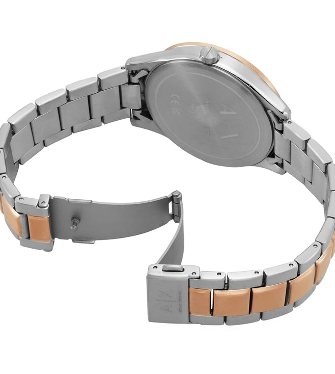 Accessorize your wrist with this men analog watch from Armani Exchange and make a style statement. The stainless steel strap showcases a two tone hue that uplifts the look of the watch. Safeguarded by a mineral glass, the black round dial. It has a crown for time adjustment. Furthermore, it is complemented with a fold-over clasp with double push button safety clasp that ensures a secure fit on the wrist.