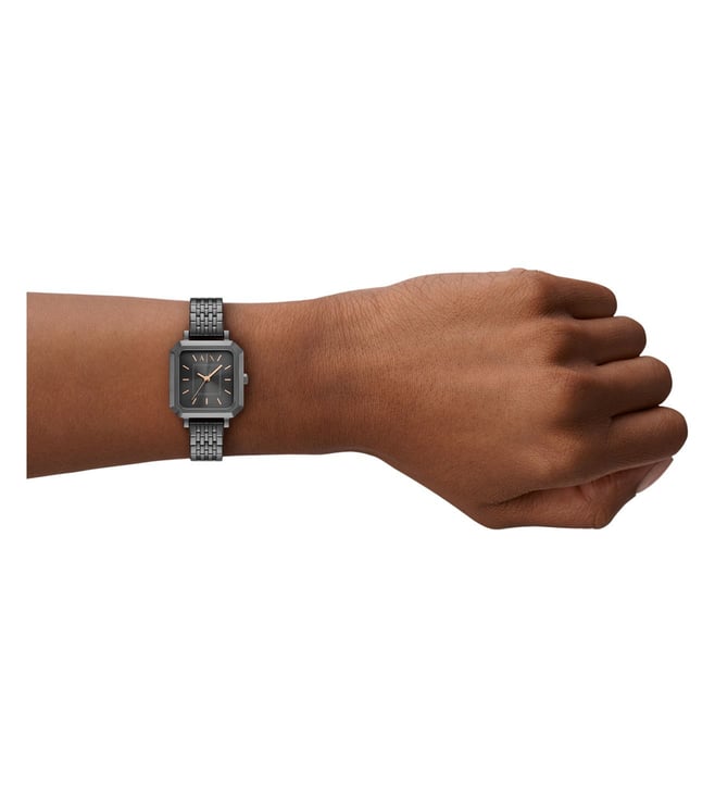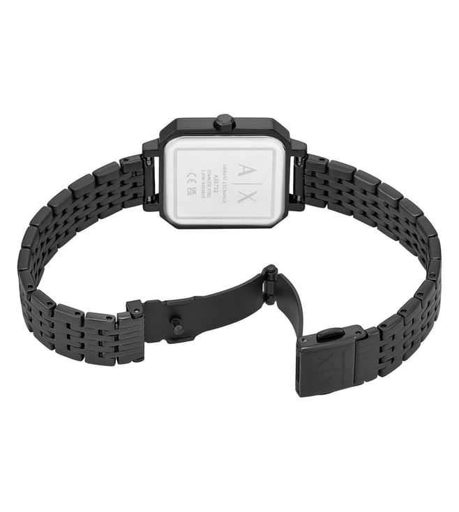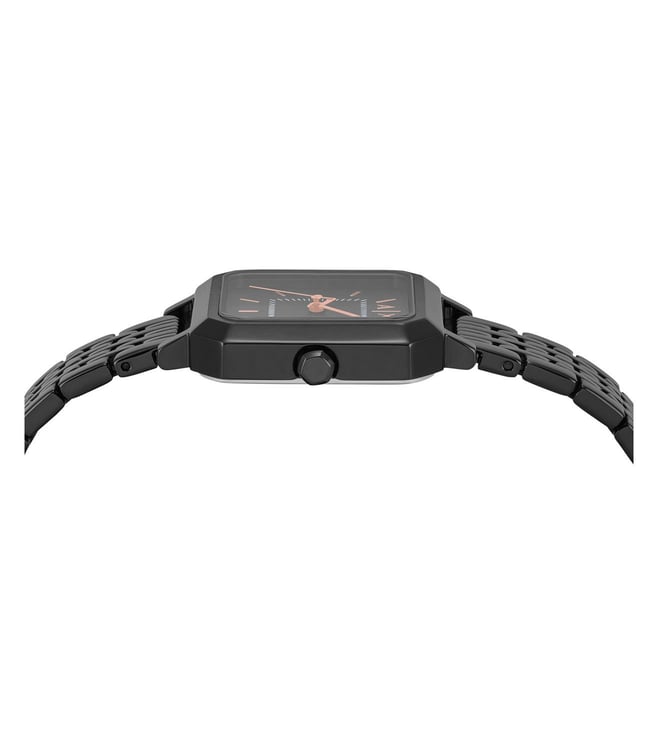 A sleek black-tone bracelet complements the rectangular case and brushed sunray dial for a design that feels minimalist yet impactful. Crafted entirely from stainless steel, its monochromatic palette emphasizes clean lines and modern sophistication. Designed with a three-hand quartz movement, this understated piece is ideal for those who prefer refined simplicity.