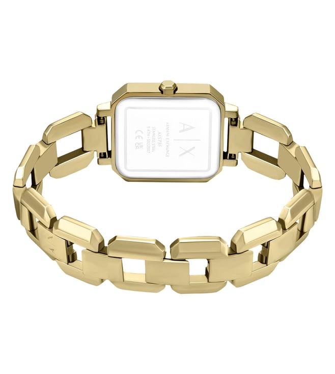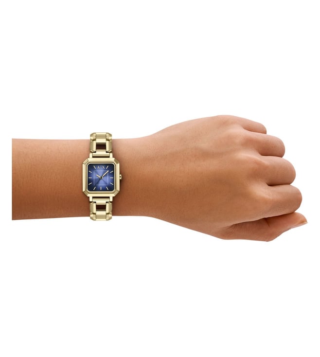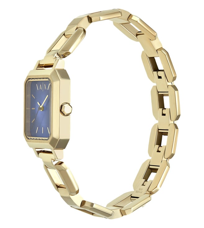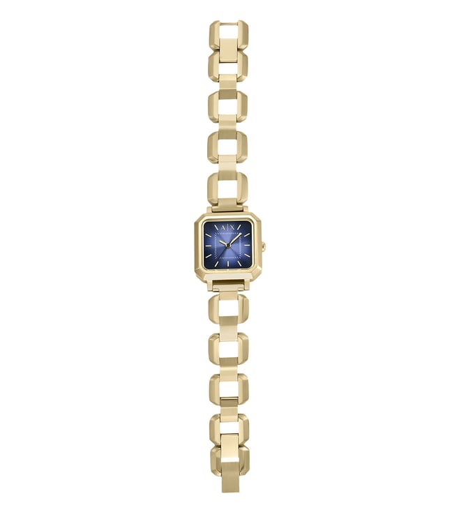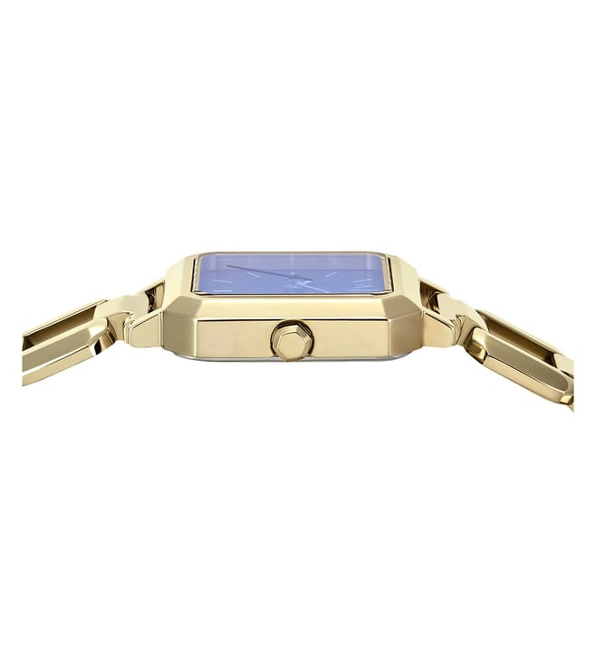 A rectangular gold-tone stainless steel case frames a vivid blue sunray dial that catches the light with every move. The streamlined jewellery inspired bracelet, crafted from gold-tone stainless steel, seamlessly complements the minimalist three-hand design. With its sleek silhouette and vibrant colour contrast, this piece balances modern design with understated luxury.