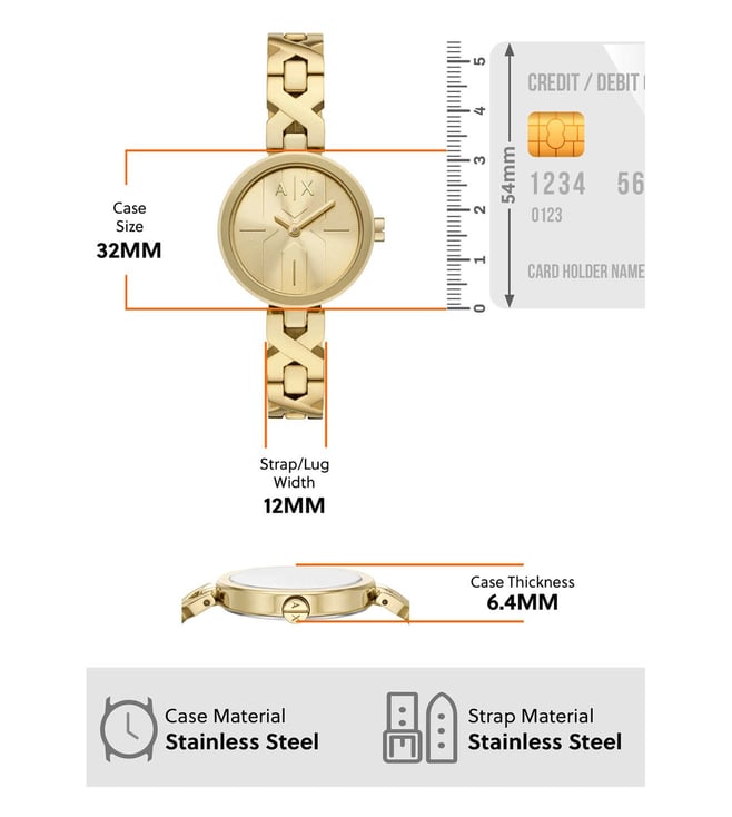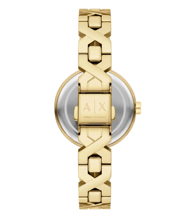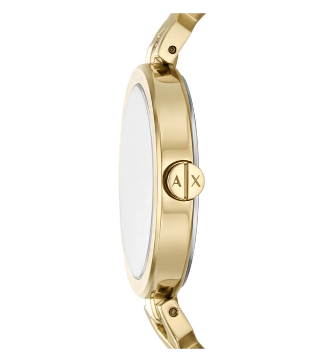 A gold-tone jewellery inspired bracelet and matching sunray dial create a seamless monochromatic look in this refined Armani Exchange watch. The round stainless steel case adds structure, and the minimalist two-hand design keeps the dial clean and modern. With its polished finish, this piece delivers understated shine and a touch of everyday sophistication.