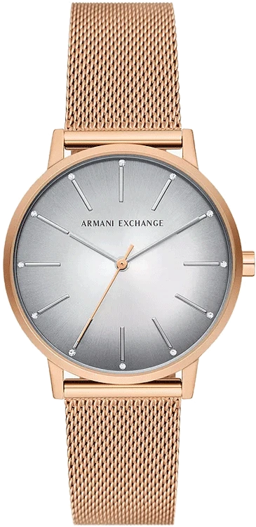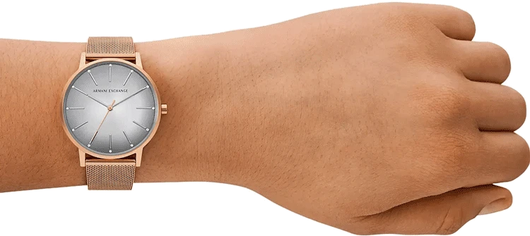 Armani Exchange's 36mm watch features a gray sunray dial, three-hand movement and rose two tone stainless steel mesh strap. This wristwatch from Armani Exchange is crafted for the moments that matter most. The watch dial is protected with mineral glass and is water resistant up to 30 m. The timepiece works on a quartz movement.