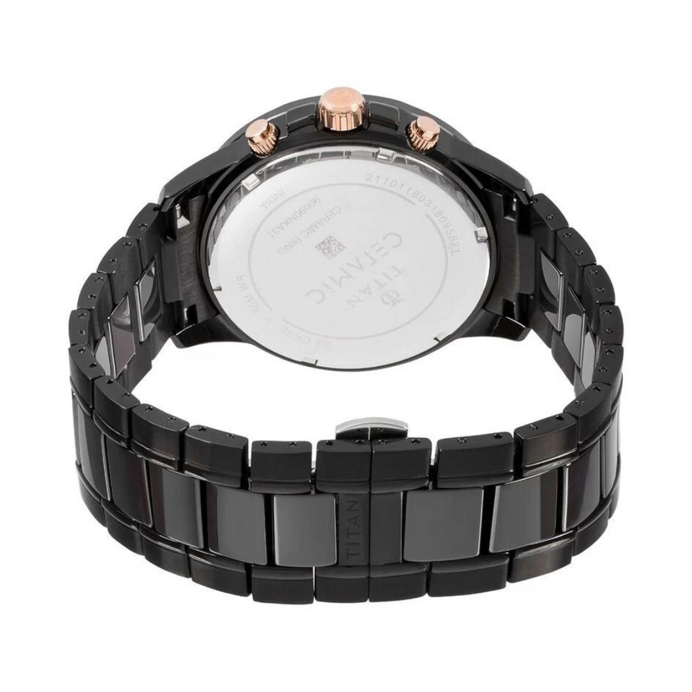 The alluring combination of mod and class, this iconic timepiece takes style to a different height. Featured in the Titan's Ceramic Collection and enclosed carefully in a round steel case is the dazzling black dial chronograph watch with the classic features to die for. The uptown textured dial in the press pattern comes with the date movement for time reading with accurate precision. The dial of the watch comes protected in a ceramic bezel ring and paired brilliantly with the bi-color strap having stainless steel bracelet with a streak of rose gold plating and black ceramic center links. The elegant strap has the double deployment clasp for the perfect fitting and the sharp dial is scratch proof with mineral glass and is 5 ATM water resistant, asking you to adorn it now for you have no reason to hold back.