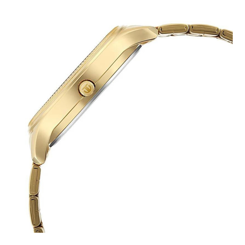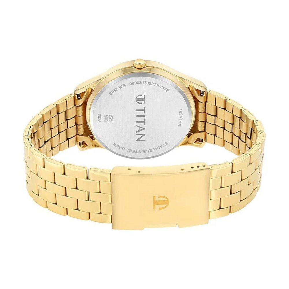 Enrich your watch collection with this men's analog watch from the Lagan collection by Titan. Protected by a mineral glass, the black round dial is housed in a 40.2 mm case. It vaunts plain three hands and a crown for time adjustment. The metal strap showcases a gold hue that uplifts the look of the watch. Moreover, it is fitted with a push-button clasp to ensure a secure fit on the wrist.