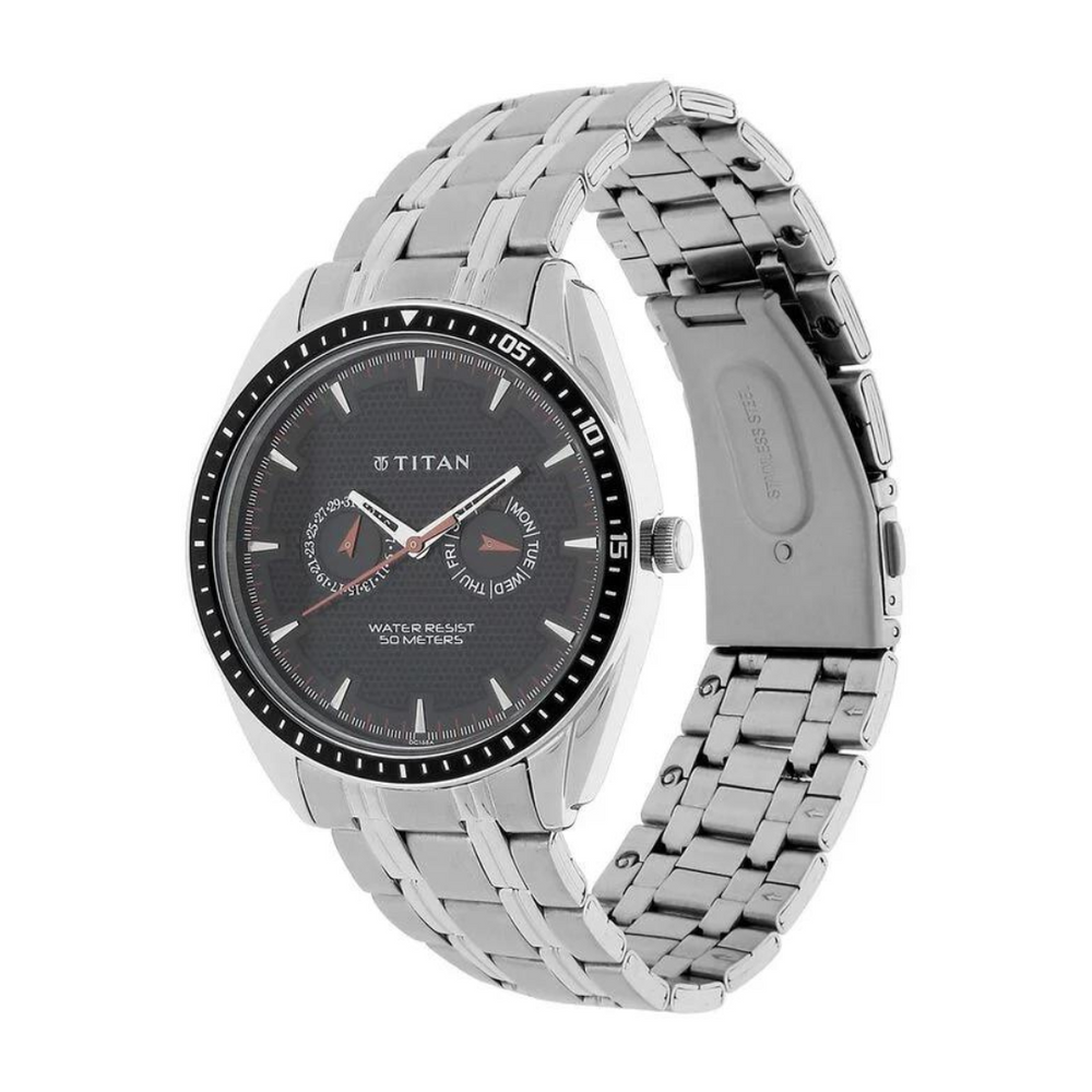 This chronograph watch for men consists of a black dotted round dial that is encompassed in a case made of brass. Two sub-dials show day and date. The dial has three plain hands, Arabic numerals to indicate the numbers as well as stick markings to indicate seconds on the bezel. A crown helps adjust the time. A stainless steel, silver coloured strap has a clasp that acts a push button.