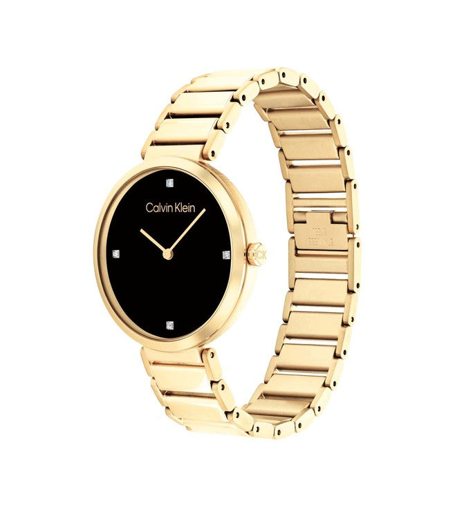Revamp your style sense by wearing the Calvin Klein watch with a minimalistic design and an open dial characterized by four crystal settings encased in a classic round metal case. True to its name, the Minimalistic T Bar collection takes one step ahead in your fashion journey with a refined open-link bracelet that adds a tinge of uniqueness to your presence.