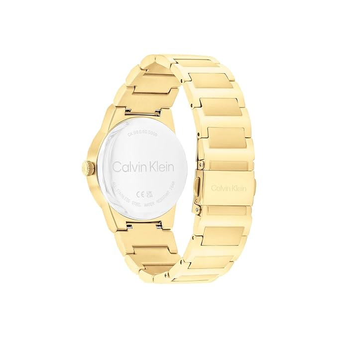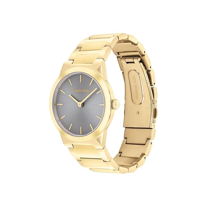 A great mix of form and functionality, this women's casual analog watch from the Ck Linear Elegance collection by CALVIN KLEIN will be a perfect pick for all watch aficionados. Enclosed in a 36 mm case, the grey round dial is secured by a mineral glass. It displays plain two hands. The stainless steel strap flaunts a gold hue that accentuates the look of the watch. Besides, it is finished with a push-button clasp that provides a secure fit on the wrist.