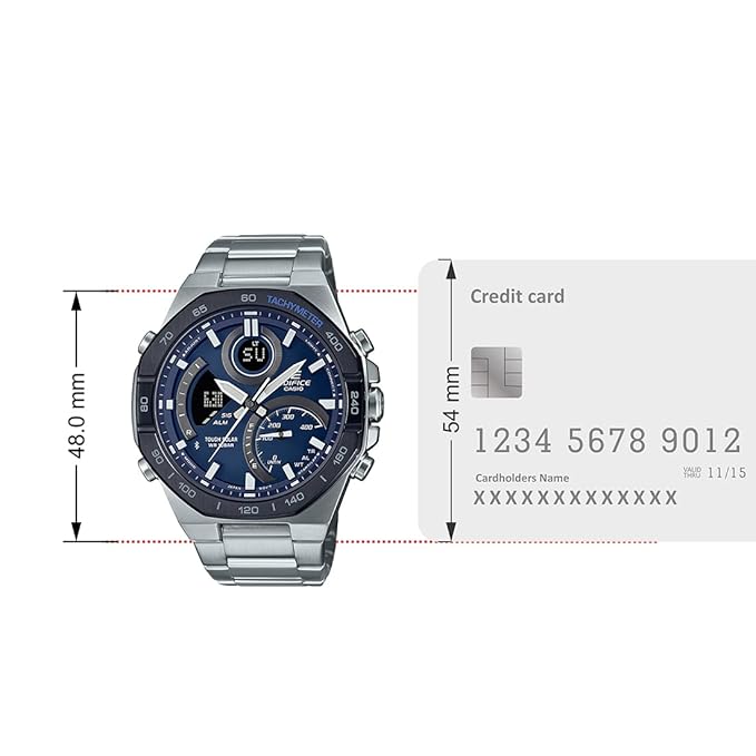 Get smartphone connectivity and so much more in an analog-digital combination EDIFICE timepiece, made to project speed and intelligence. The bold, sophisticated design features an octagonal bezel that evokes the lines of a race car mechanic’s tools. More than just an eye catcher, this watch delivers full-on functionality so you can get all the information you need on the easy-read hands and LCD. Sync with your smartphone via Bluetooth® for precision timekeeping, wherever you go. Simply tap on the app to effortlessly manage functions like selecting a city from the World Time list. The large inset dial at the 4 o’clock position boasts a speed indicator that displays average speeds when timing laps for set distances. The fully automatic LED light illuminates the dial and LCD with just a tilt of the wrist. Tough Solar charges the watch from sunlight or even fluorescent lamp light