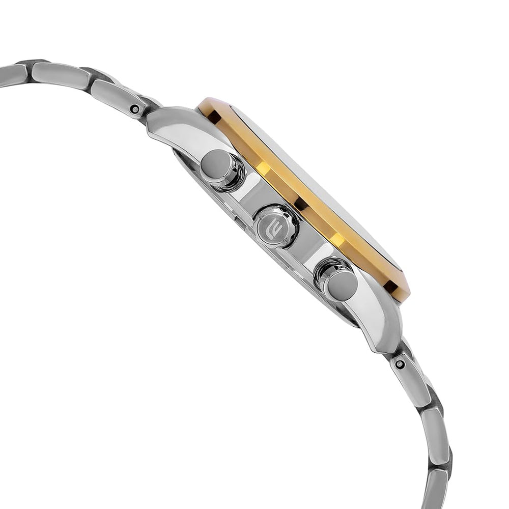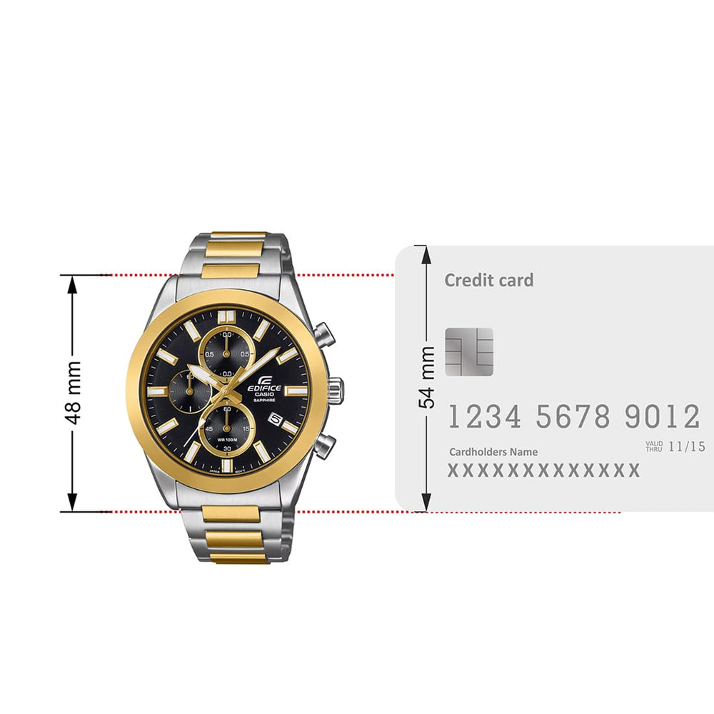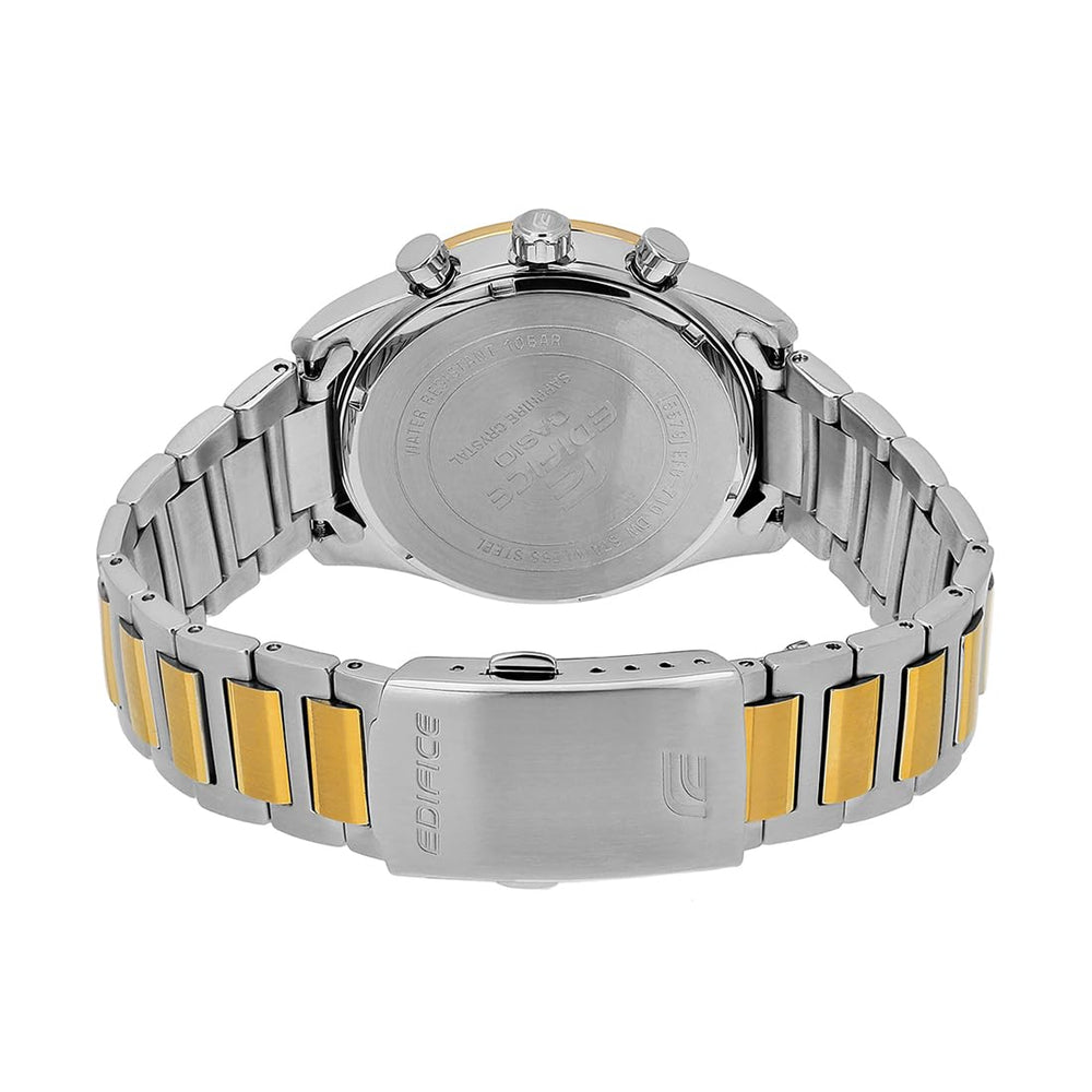 Calling all motorsports and car enthusiasts! Introducing the stylish two-tone silver and gold EDIFICE wristwatch packed with functionality that keeps you on track all day. Featuring a 41mm case, this timepiece makes a bold statement and delivers outstanding sports chronograph performance. The solid stainless-steel band is crafted in H-shaped links for an even more comfortable fit, and scratch-resistant sapphire crystal glass provides excellent durability. Water resistance up to 100 meters frees you to focus on more exciting things, no matter what comes your way