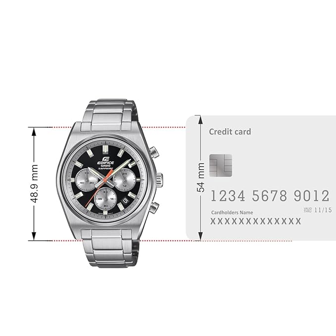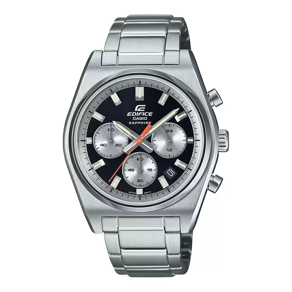 Introducing the EDIFICE motorsports chronograph inspired by the classic sportscar. Striking index bars join the legendary 3-6-9 inset dial layout in a time-honored sporty design. The smaller diameter of the case presents an elegant look of sheer speed. With sapphire crystal, stainless-steel case, and substantial stainless-steel band, this timepiece is water resistant up to 10 bars. This sporty, classic chronograph takes you from casual settings to business meetings in a split second.