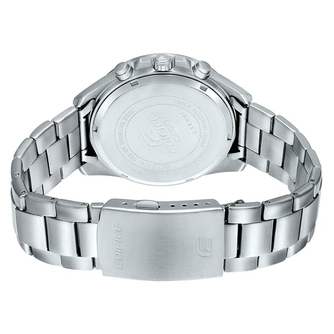 "A large standard EDIFICE chronograph. Use of an extra-thick inset dial creates a powerful, dynamic design. EFV-550D-1AV Sporty design 10 bar water resistant Specifications Basic Information Case size (L× W× H) 53 × 47 × 12.1 mm Weight 156 g Case and bezel material Case / bezel material: Stainless steel Band Stainless Steel Band One-touch 3-fold Clasp Water resistance 100-meter water resistance Power supply and battery life Approx. battery life: 3 years on SR920SW Exterior Glass Mineral Glass Back plate Screw Lock Back Watch Features Stopwatch 1/10-second stopwatch Measuring capacity: 59'59.9'' Measuring modes: Elapsed time, split time, 1st-2nd place times Accuracy Accuracy: ±20 seconds per month Other features Regular timekeeping: Analog: 3 hands (hour, minute, second), 3 dials (stopwatch 1/10 seconds, stopwatch minutes, stopwatch seconds) Date display Operation Guide"
