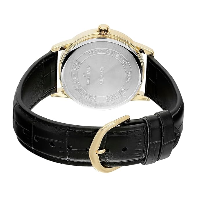 Crafted with precision, this analog watch from the Enticer collection by Casio is a must-have in every men's watch collection. Secured by a mineral glass, the white round dial is housed in a 44 mm case. It exhibits plain three hands. The leather strap exudes a black hue that accentuates the look of the watch. Moreover, it is equipped with a buckle clasp to ensure a secure fit on the wrist.
