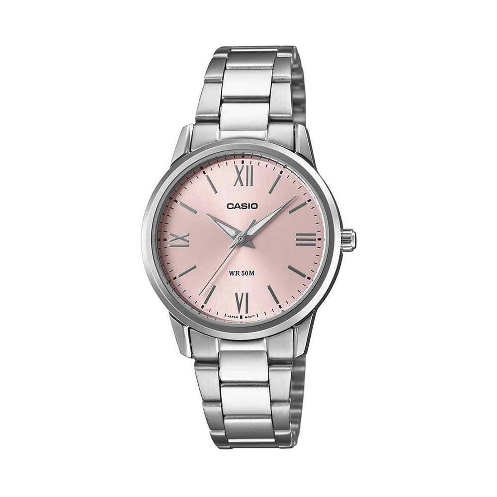 Elevate your style with the Casio Enticer Ladies LTP-1303DD 4AVDF, a perfect blend of elegance and everyday functionality. Featuring a sleek metal band paired with a charming pink dial, this analog watch exudes feminine sophistication and subtle vibrance. The durable stainless steel construction ensures long-lasting wear, while the clear, easy-to-read dial keeps you punctual with grace. Whether for work, casual outings, or special occasions, this timepiece adds a delicate pop of color and timeless charm to any outfit. Experience reliable precision and refined beauty wrapped around your wrist with the Casio Enticer Pink Dial Watch