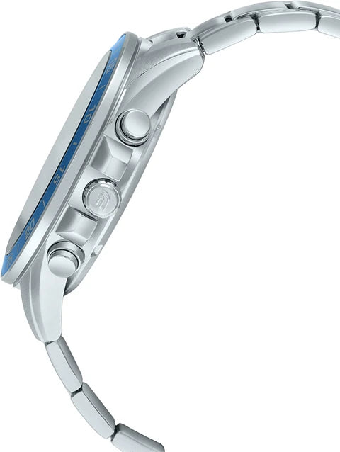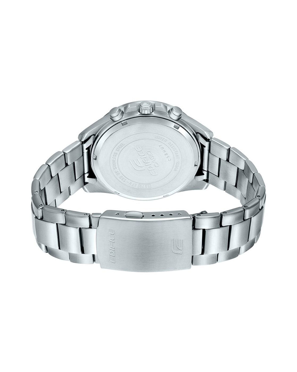 "A large standard EDIFICE chronograph. Use of an extra-thick inset dial creates a powerful, dynamic design. EFV-550D-1AV Sporty design 10 bar water resistant Specifications Basic Information Case size (L× W× H) 53 × 47 × 12.1 mm Weight 156 g Case and bezel material Case / bezel material: Stainless steel Band Stainless Steel Band One-touch 3-fold Clasp Water resistance 100-meter water resistance Power supply and battery life Approx. battery life: 3 years on SR920SW Exterior Glass Mineral Glass Back plate Screw Lock Back Watch Features Stopwatch 1/10-second stopwatch Measuring capacity: 59'59.9'' Measuring modes: Elapsed time, split time, 1st-2nd place times Accuracy Accuracy: ±20 seconds per month Other features Regular timekeeping: Analog: 3 hands (hour, minute, second), 3 dials (stopwatch 1/10 seconds, stopwatch minutes, stopwatch seconds) Date display Operation Guide"