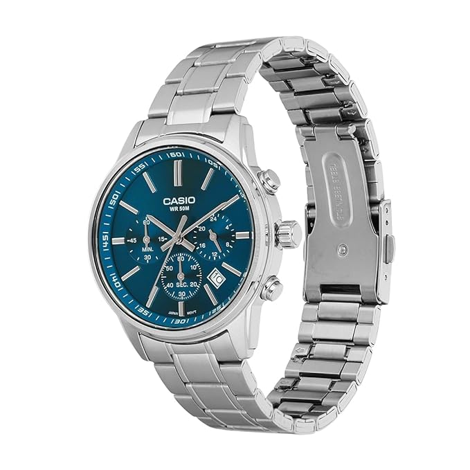A cool metal analog timepiece with the sporty chronograph design you love and the detailed display you need. Three inset dials display 24-hour time, second stopwatch, and minute stopwatch. Water resistance up to 50 meters frees you from worry, even on rainy days.