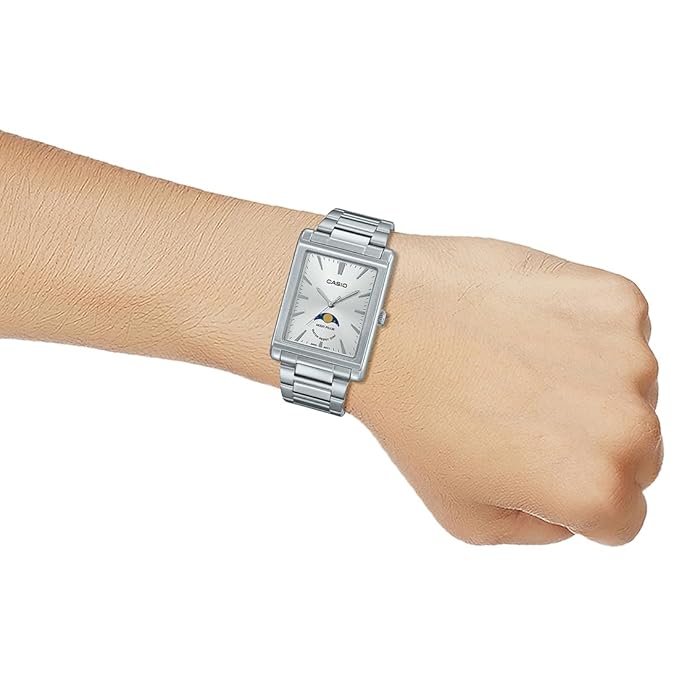 This men's analog watch is from the Enticer collection by Casio. The white rectangular-shaped dial features plain 3-hand functionality for time adjustment. This stylish watch features a moon phase indicator to take you where you want to go, whether on or off the clock. The watch works on a quartz movement. The stainless steel bracelet comes in a silver hue that further elevates the look of the watch. Besides, it is completed with a push button clasp to ensure a secure fit on the wrist.
