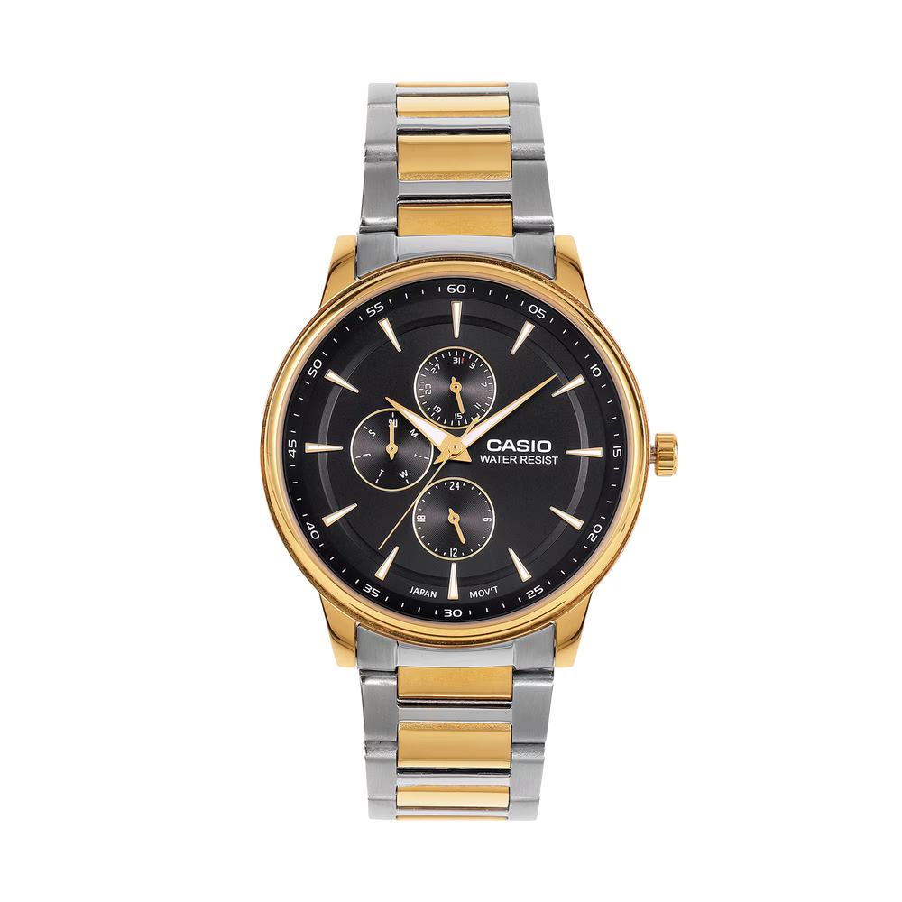 Refined yet bold, the CASIO MTP-SN3KSG-1A is a masterclass in contrast and craftsmanship. Its deep black round dial is accented by gold-tone markers and hands, offering a rich, elegant look that stands out without shouting. The clean analog layout ensures easy readability while maintaining a timeless aesthetic. Designed with a robust stainless steel case and a two-tone bracelet in silver and gold, this watch blends versatility with visual appeal. Precision quartz movement powers the timekeeping, while water resistance adds practicality for daily use. Whether it's a formal occasion or a day at the office, the MTP-SN3KSG-1A adds a confident edge to any outfit — a watch built for those who appreciate subtle luxury with lasting performance