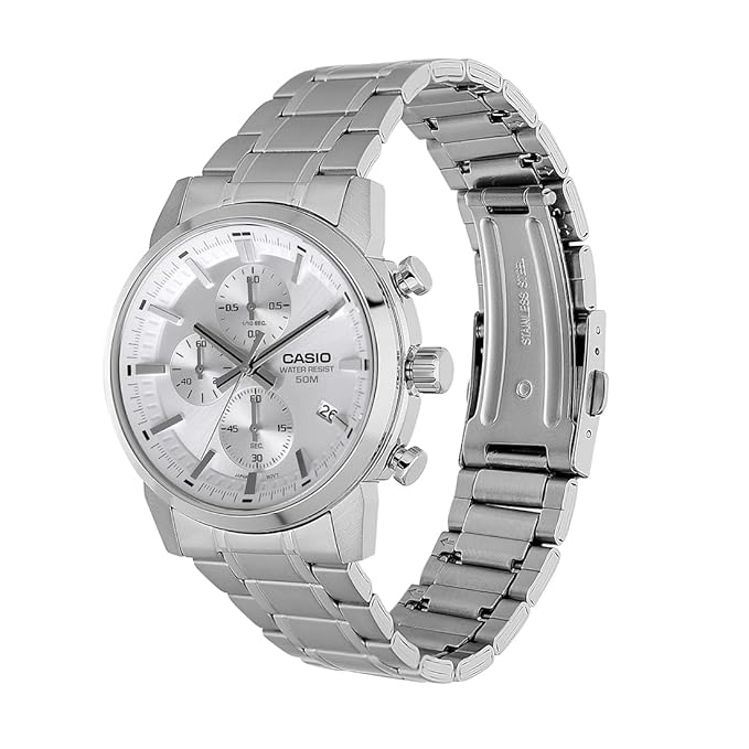 This bold metal analog timepiece effortlessly blends sporty style with precise functionality. Equipped with three distinct inset dials, it offers stopwatches that track time down to the minute, second, and 1/10th of a second. Designed for those who demand accuracy, it’s also water-resistant up to 50 meters, giving you the freedom to wear it confidently, rain or shine. Whether for work or play, this watch keeps you on time and on trend.