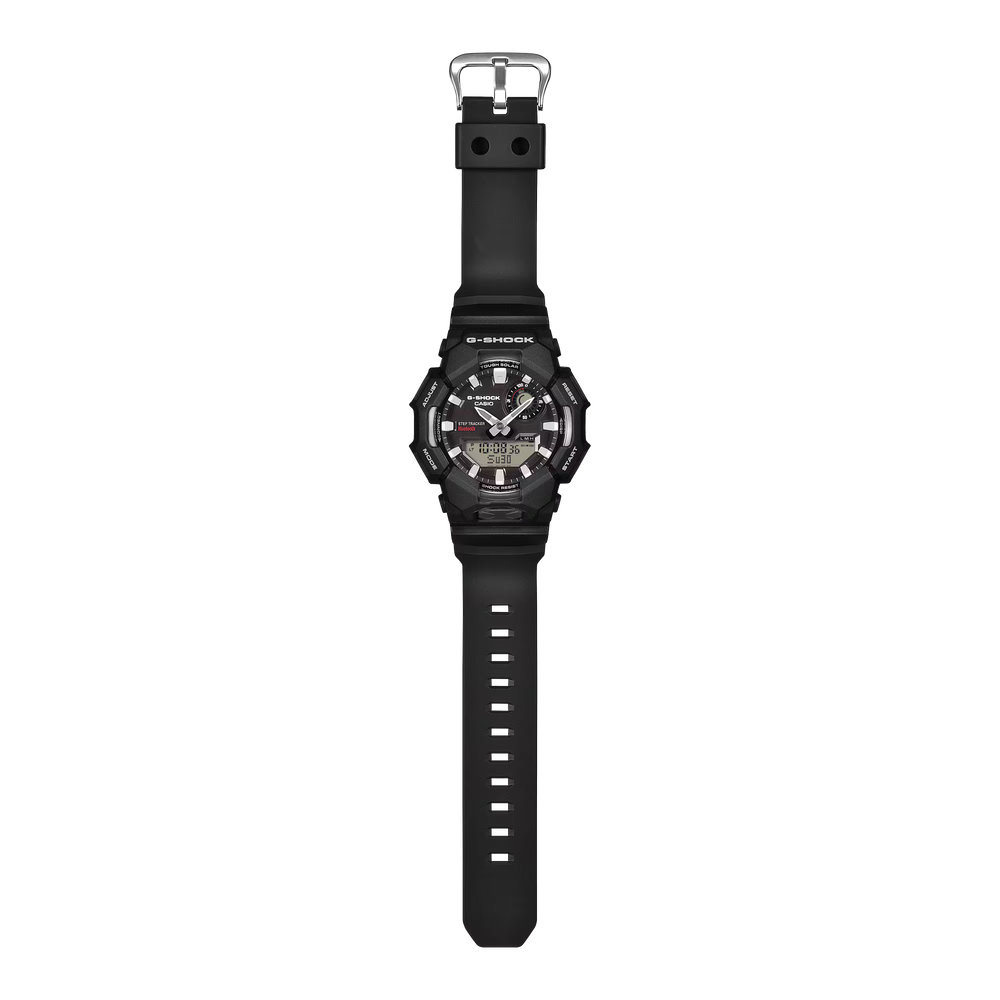Introducing the solar-power-only watch capable of tracking and digitally displaying steps. The analog-digital combination GA-B010 features a large case with large, easy to read display. Deliciously detailed finishes — with a bezel ring treated to a vapor deposition finish, a sun-ray finish for the dial, and a metallic finish applied to the inset dial — add extra value to the toughness-oriented design. This watch requires only solar power to count steps and display tracked data on the digital display. The watch also sends data to a paired smartphone via Bluetooth®, for full functionality at your fingertips. Simply tap into the CASIO WATCHES app for automatic precision timekeeping and to easily manage life logs from your phone. The watch delivers handy features like world time and stopwatch, as well as a high-brightness LED light that can be turned on and off using the large button on front of the case. Indexes and watch hands with phosphorescent finish ensure visibility even in the dark. The watch is also made with bio-based resin, a material expected to reduce environmental impact. Taking you from casual settings to business meetings with ease, this is a timepiece to enjoy for years to come.
