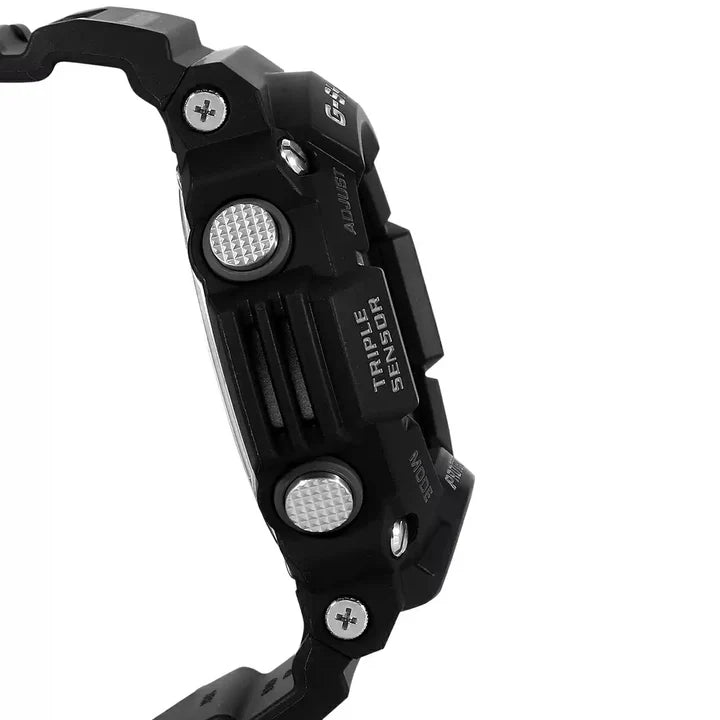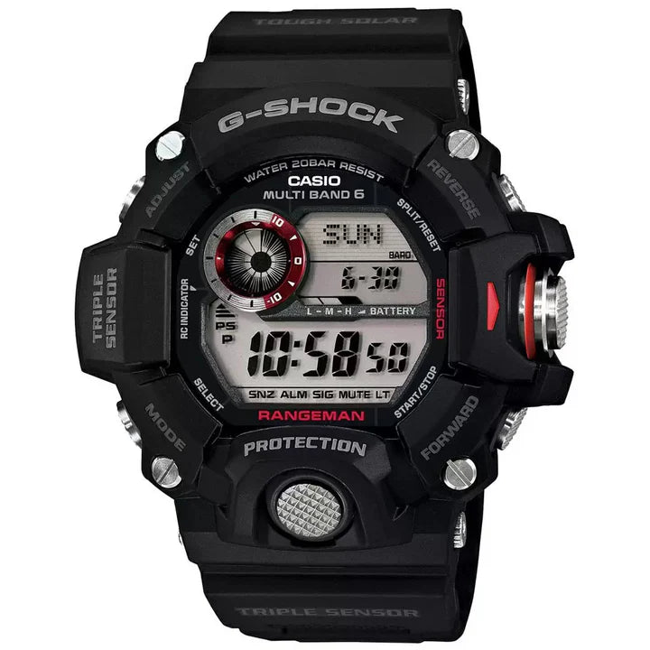 Introducing RANGEMAN, the latest addition to the Master of G series of tough and rugged timepieces that are designed and engineered to stand up to the most grueling conditions imaginable. RANGEMAN is Triple Sensor equipped, which makes it capable of keeping altitude, barometric pressure, temperature, and direction readings at your fingertips. Cylindrical buttons provide outstanding operation and improved resistance to impact. The frequently used sensor button (center right) has a metal cover that protects it against lateral impact and keeps foreign matter out. Pressing the sensor button in any mode takes you directly to a sensor screen. Each sensor mode has its own audible tone, which means you can determine which mode you are entering without even looking at the watch. All of this plus one-touch time recording, one-touch elapsed time measurement, world-renowned G-SHOCK toughness and durability, and much more makes RANGEMAN the perfect choice for rangers, rescue crews, and anyone else whose profession or activities demand unfailing reliability.