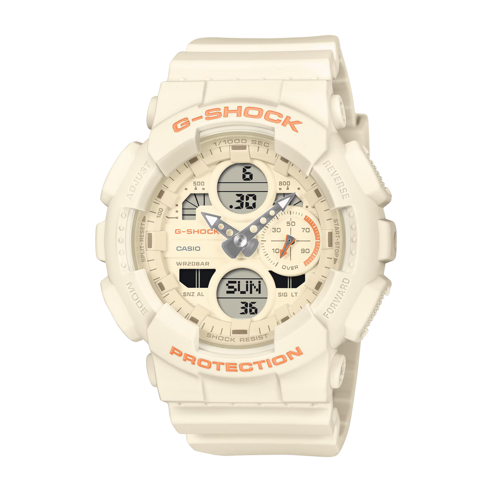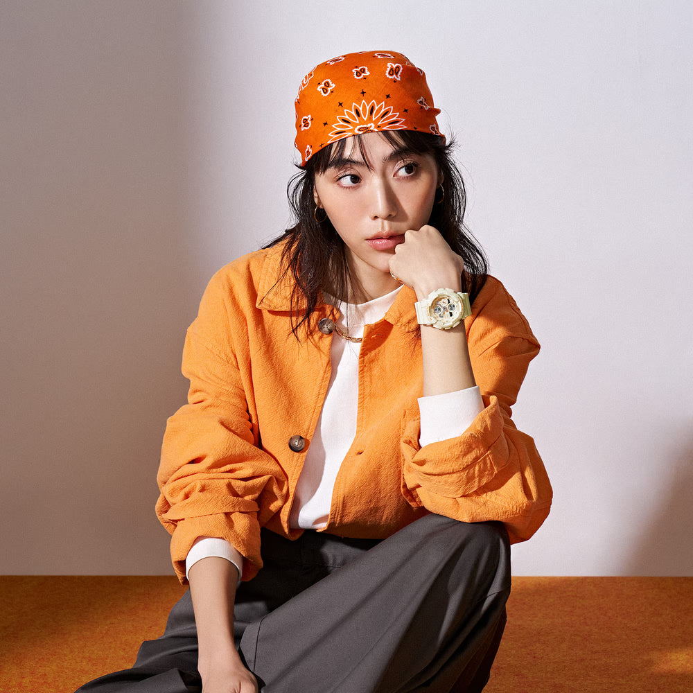 Brighten your day with an easy-to-wear ivory G-SHOCK with touches of warm matte orange. The gray tone of the mode and feature indicators and overall matte finish presents a subtle, clean, effortlessly confident look. Meticulously designed down to the smallest details, these timepieces complement any style — the ideal accessory to bring a subtle touch of color to everyday casual outfits. Key components for the bezel and band are made with bio-based resin. Produced using renewable organic resources, this material is expected to help reduce environmental impact.