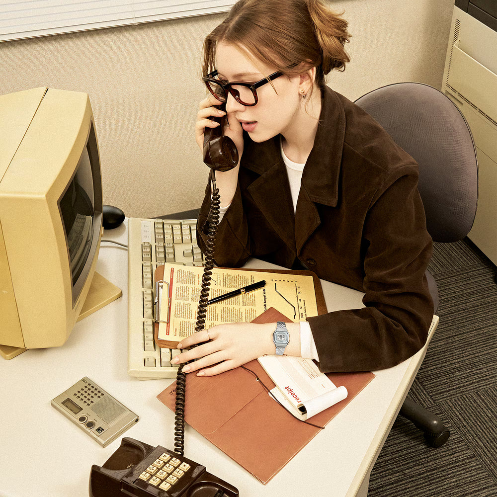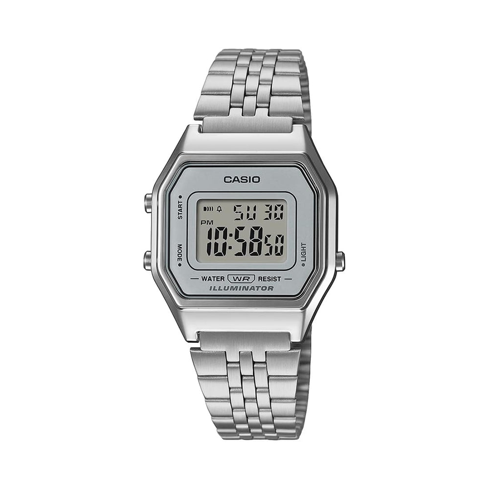 This watch features a digital display, LED illuminator, 1/100-second stopwatch, and alarm. It is paired with a stainless steel link bracelet secured with a deployant clasp and finished with water resistance for everyday use