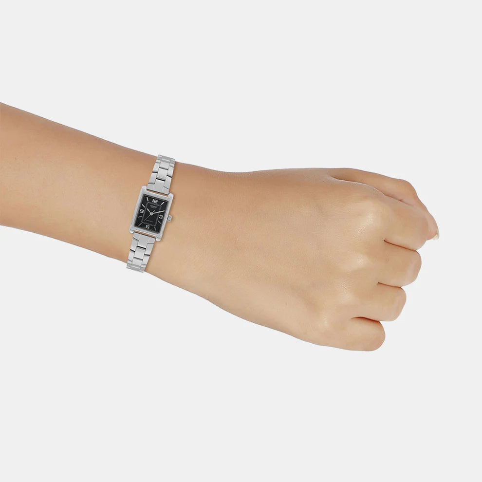 Crafted with a stainless-steel strap and bold indices, this water-resistant analog watch gets your contemporary wheels in motion.Dial Color:Black,Strap Color:Silver,Code:A2353 Make a singular statement with the timelessness of a classic analog watch with tonneau case.