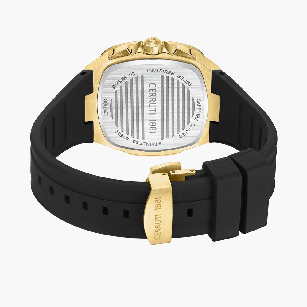 Amaze everyone around you by wearing this men's watch from the collection by Cerruti 1881. The black square dial is protected by a sapphire glass. It features crown for time adjustment. The silicon strap comes in a black hue that further elevates the look of the timekeeper. Besides, it is completed with a deployment buckle clasp to ensure a secure fit on the wrist.