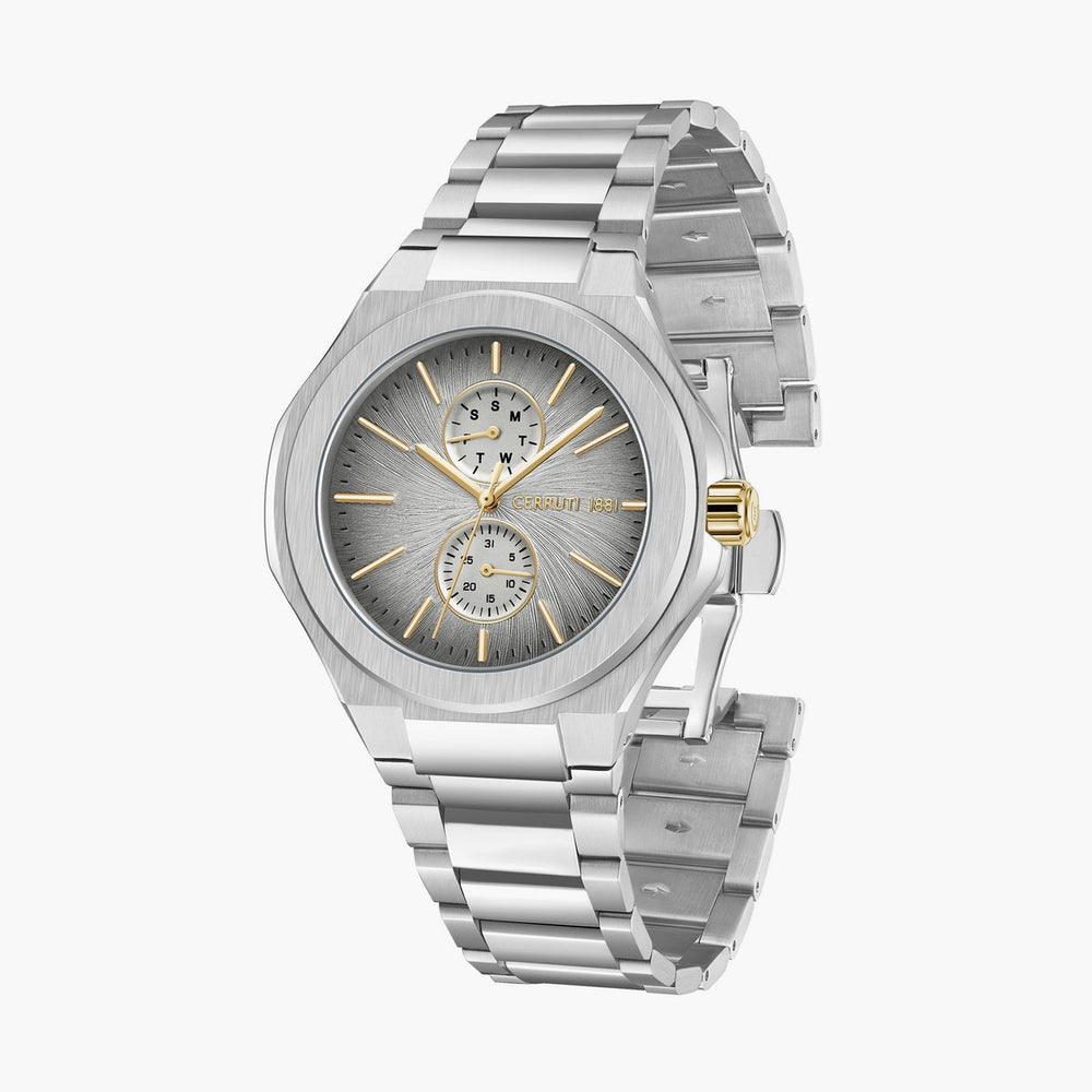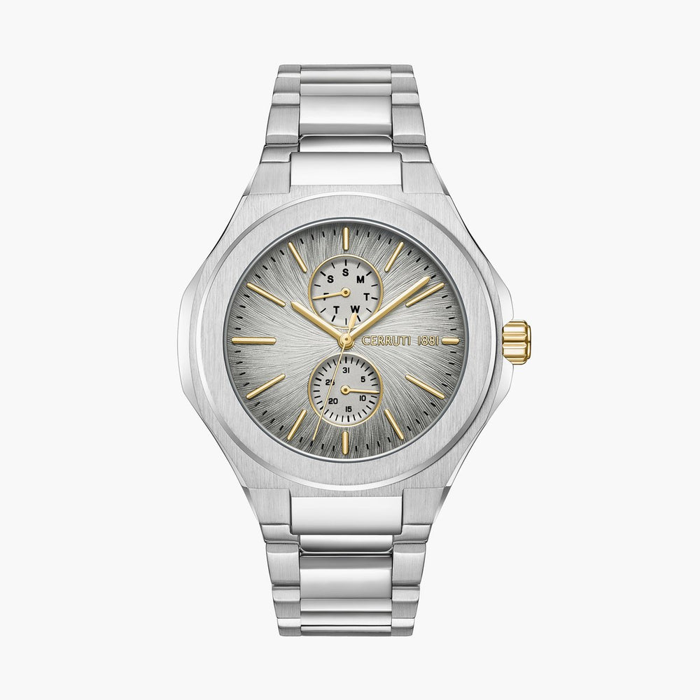 Designed to suit the preference of urban men, this watch from the collection by Cerruti 1881 is sure to make a style statement. Secured by a sapphire glass, the mother of pearl round dial is protected in a case. It exhibits crown for time adjustment. The stainless steel strap flaunts a silver hue that accentuates the look of the watch. Moreover, it is fitted with a fold-over clasp with double push button safety clasp to ensure a secure fit on the wrist.