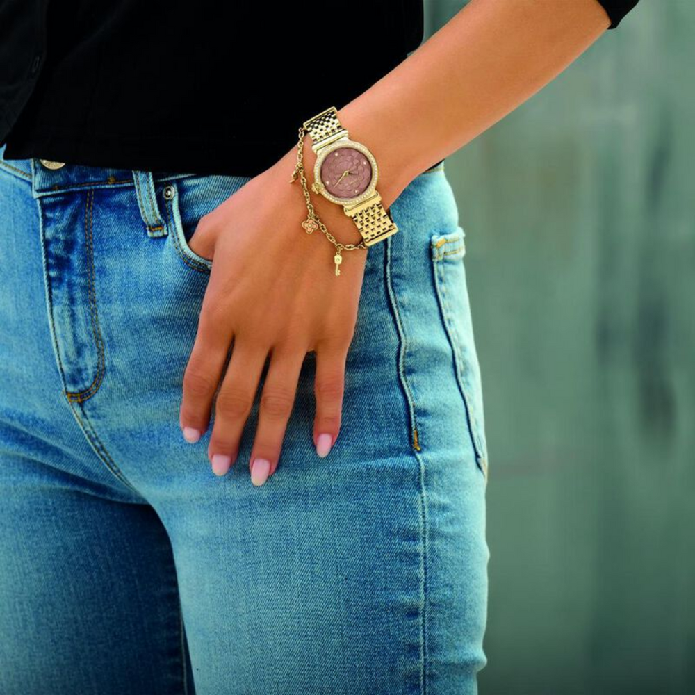 Fashioned with a stylish design, this charming watch gives you the fashion statement that you always wanted. Showcasing a charming round dial adorned with two-hand movement adds a touch of charm. This timepiece carries a perfectly feminine look that comes with an additional chain bracelet to add a unique jewellery accent to the design. The elegant and streamlined bracelet makes it practically stylish.