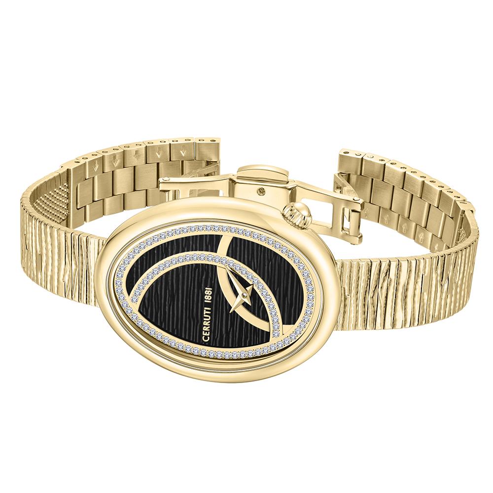 The intriguing design of Cozzana, oval, with a textured black dial adorned with shimmering clear crystals, enchants all who gaze upon it. Truly a masterpiece, Cerruti 1881 infuses feminine beauty through exquisite detailing, setting it apart as a symbol of sophistication. Delicate touches on the dial orchestrate a symphony of style, demanding admiration at every glance.