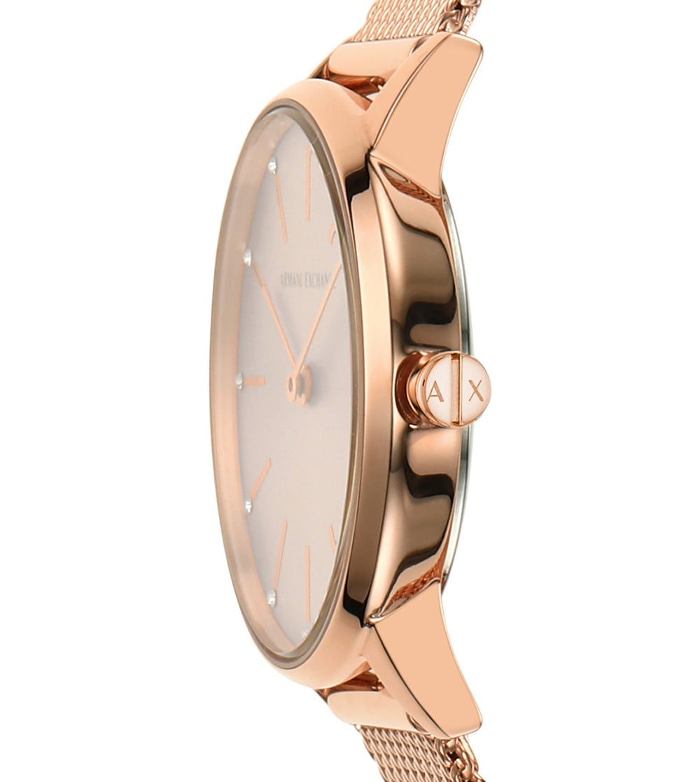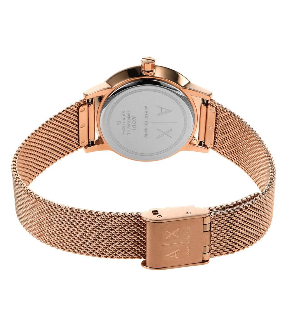 Analog Watch AX7121 Add a stylish dimension to your look by wearing this women's analog watch from Armani Exchange. Covered by a mineral glass, the silver round dial is nestled in a case. It vaunts plain 2-hand, and a crown for time adjustment. The strap exudes a rose gold hue that accentuates the look of the timepiece. Moreover, it is fitted with a deployment clasp clasp that ensures a secure fit on the wrist.