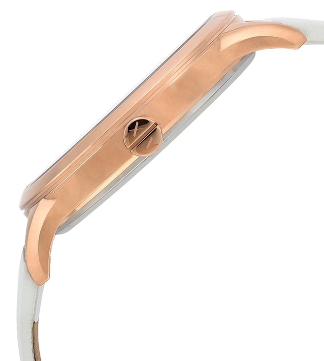 AX5604Add a stylish dimension to your look by wearing this women's analog watch from Armani Exchange. Covered by a mineral glass, the silver round dial is nestled in a case. It vaunts plain 2-hand, and a crown for time adjustment. The strap exudes a rose gold hue that accentuates the look of the timepiece. Moreover, it is fitted with a deployment clasp clasp that ensures a secure fit on the wrist.