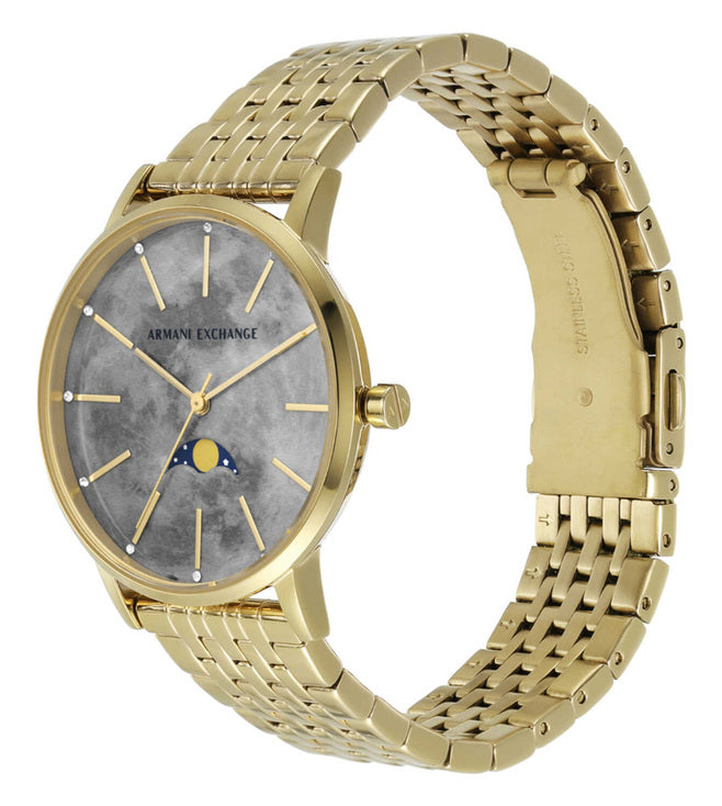 Add a stylish dimension to your look by wearing this women's analog watch from Armani Exchange. Armani Exchange's 36mm watch features a moon inspired multicolor grey dial, moonphase multifunction movement, gold-tone at least 50% recycled stainless steel case and gold-tone stainless steel bracelet. The grey round dial is protected by a mineral glass. The stainless steel strap comes in a gold hue that further elevates the look of the timekeeper. Besides, it is completed with a fold-over push button clasp with safety clasp to ensure a secure fit on the wrist.