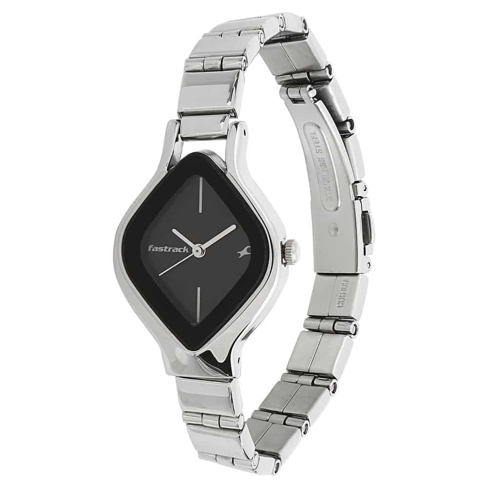 Add a finishing touch to your stylish attire by wearing this 6109SM02 women black analog watch from Fastrack Animal Instinct collection. This casual plain three hand watch has a diamond shaped dial and quartz type movement. The strap is made of premium quality metal and is sure to last for a long time. The strap is silver in colour which lends a rich look to it. It comes with a brand warranty of 2 years.