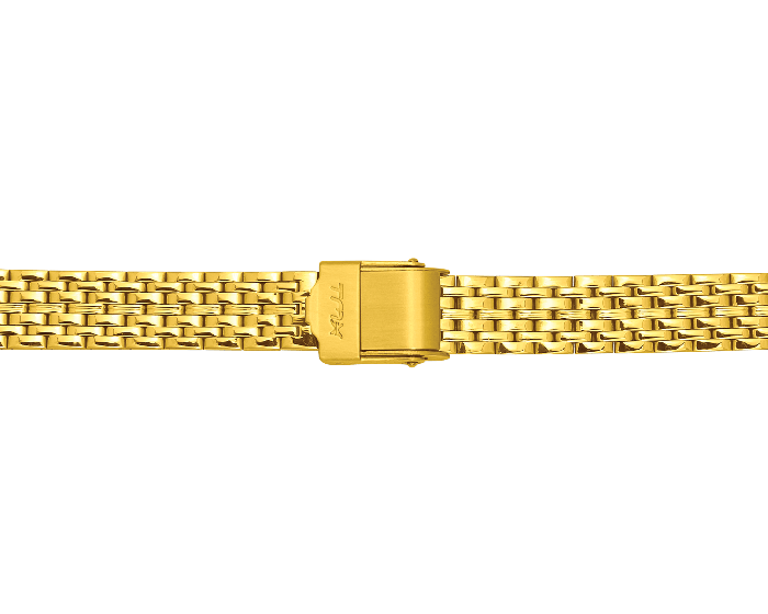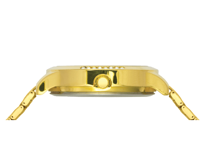 Glam up your look with this crystal studded watch with a white dial and a gold tone bracelet