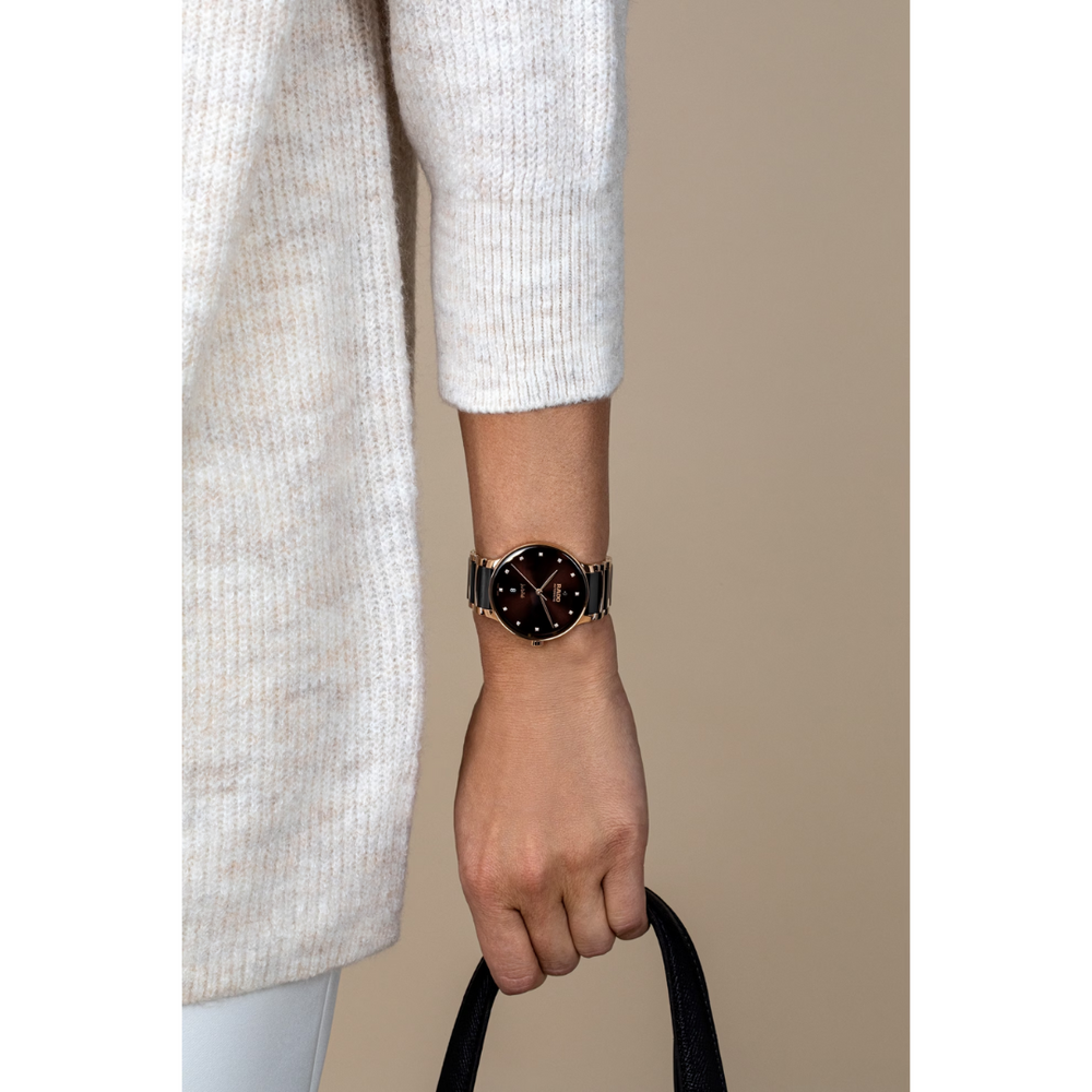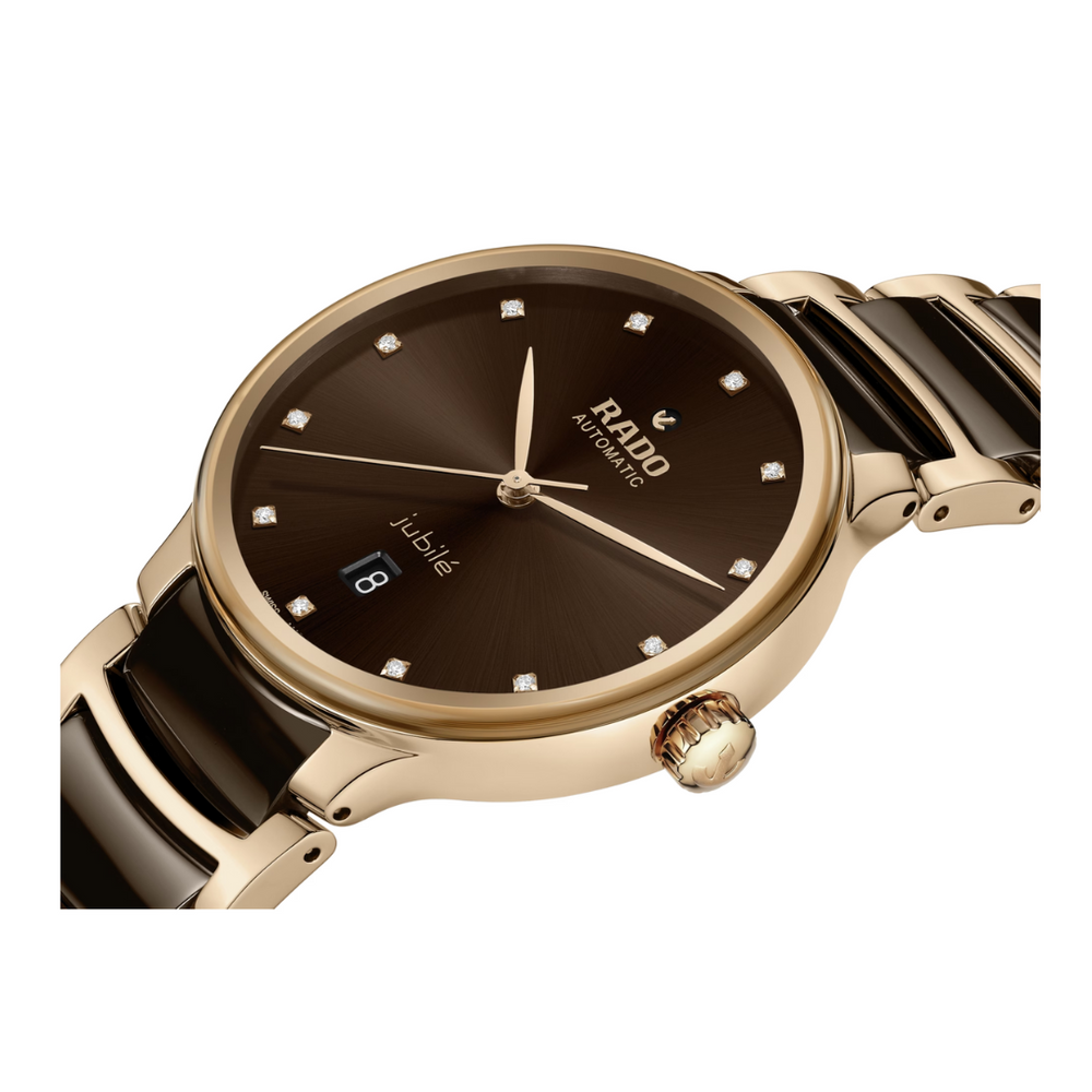 The classic Centrix Automatic Diamonds watch has been reworked not only technically, but also aesthetically. The modified model has a rounded sapphire crystal that extends all the way to the edge and a curved case blending with the curved crystal edge. The overall appearance of this iconic timepiece is completed with adjusted case lugs and a bracelet made of polished rose-gold-coloured PVD-coated stainless steel with brown high-tech ceramic middle links. The brown sunray dial with 12 diamonds, emphasised with the printed “jubilé” logo, matches perfectly with the rose-gold-coloured hands. Inside, the three-hand calibre R763 movement exceeds standard accuracy test requirements from 3 to 5 positions, thanks to its antimagnetic Nivachron™ hairspring for increased reliability and accuracy. The watch is water resistant down to 50 m and offers 80 hours of power reserve.